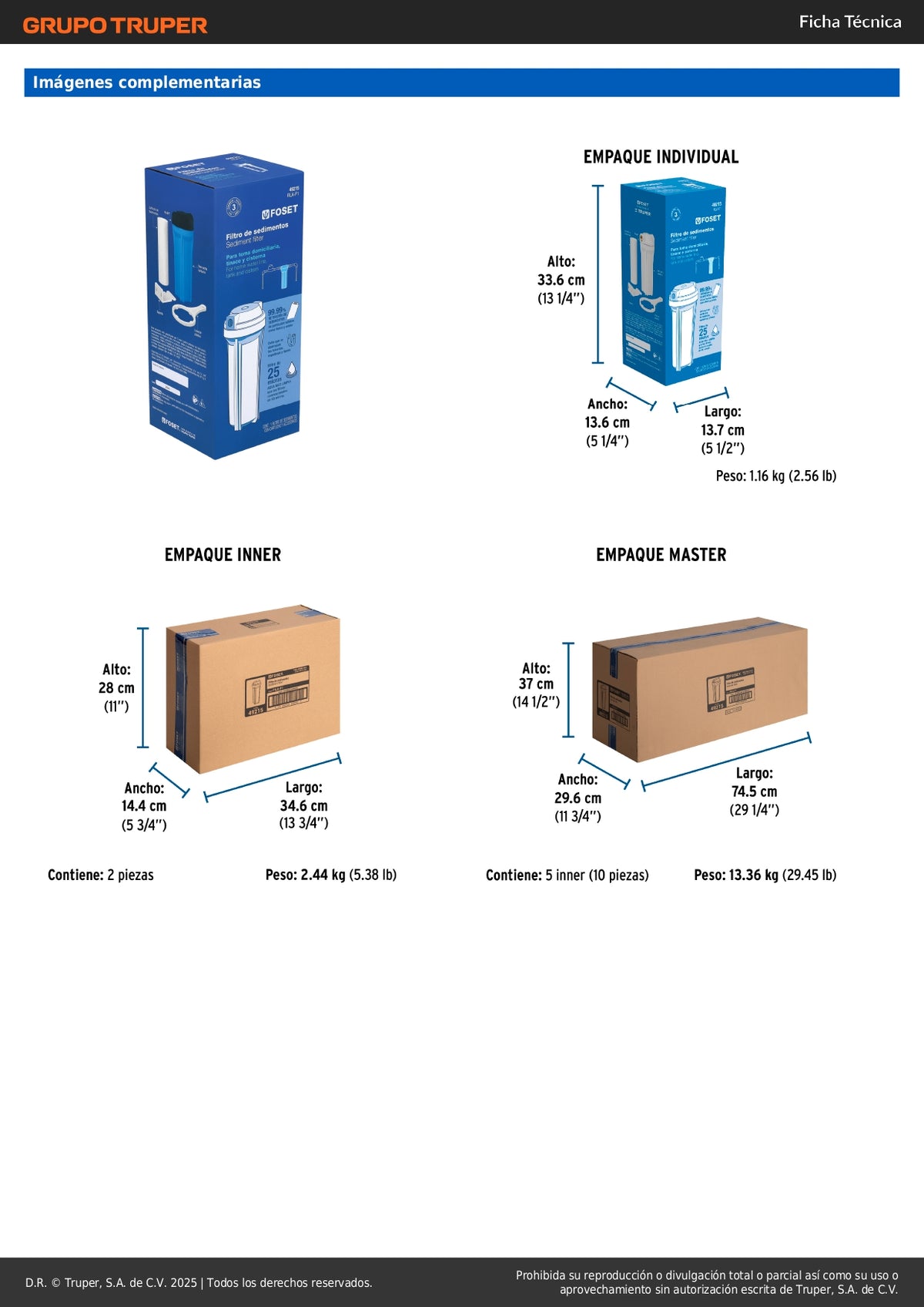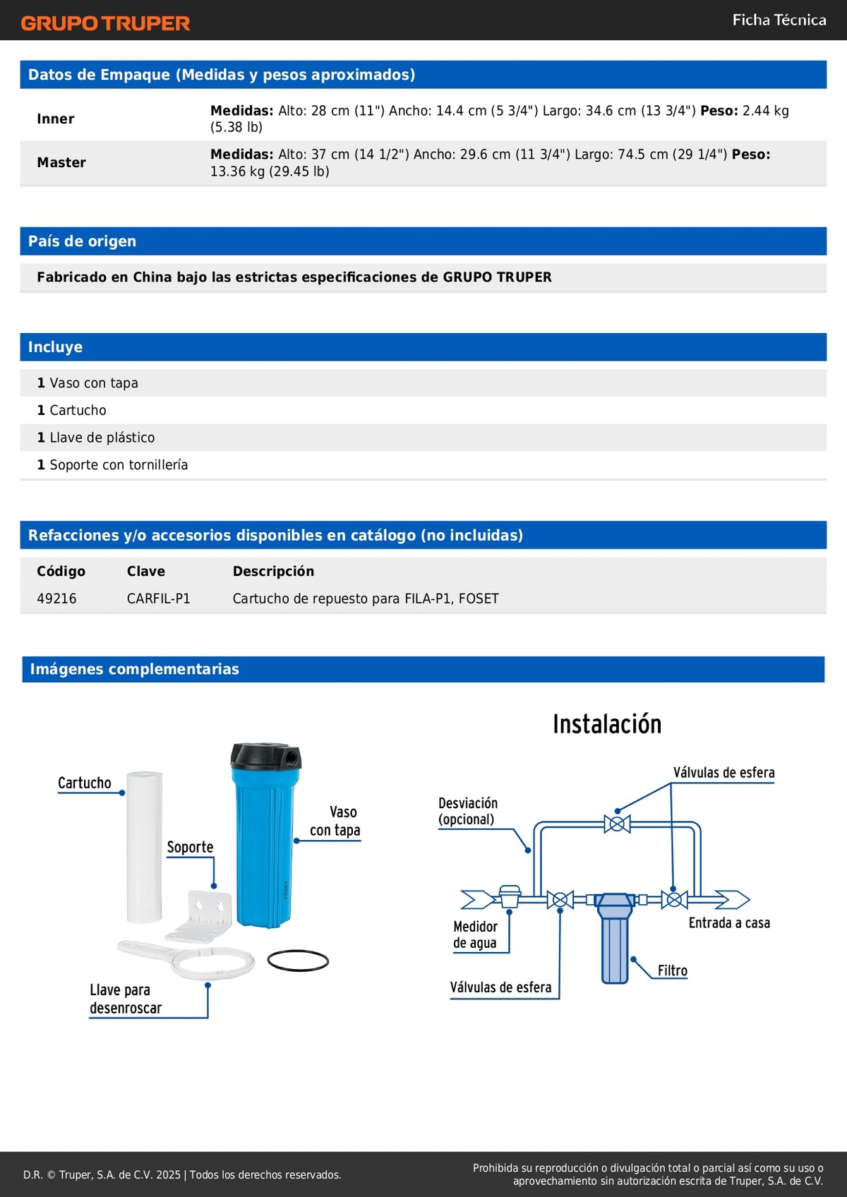 Filtro de Sedimentos FOSET FILA-P1 - Elimina Tierra y Arena del Agua - Protege Tuberías y Llaves - Polipropileno para Casa, Tinaco y Cisterna