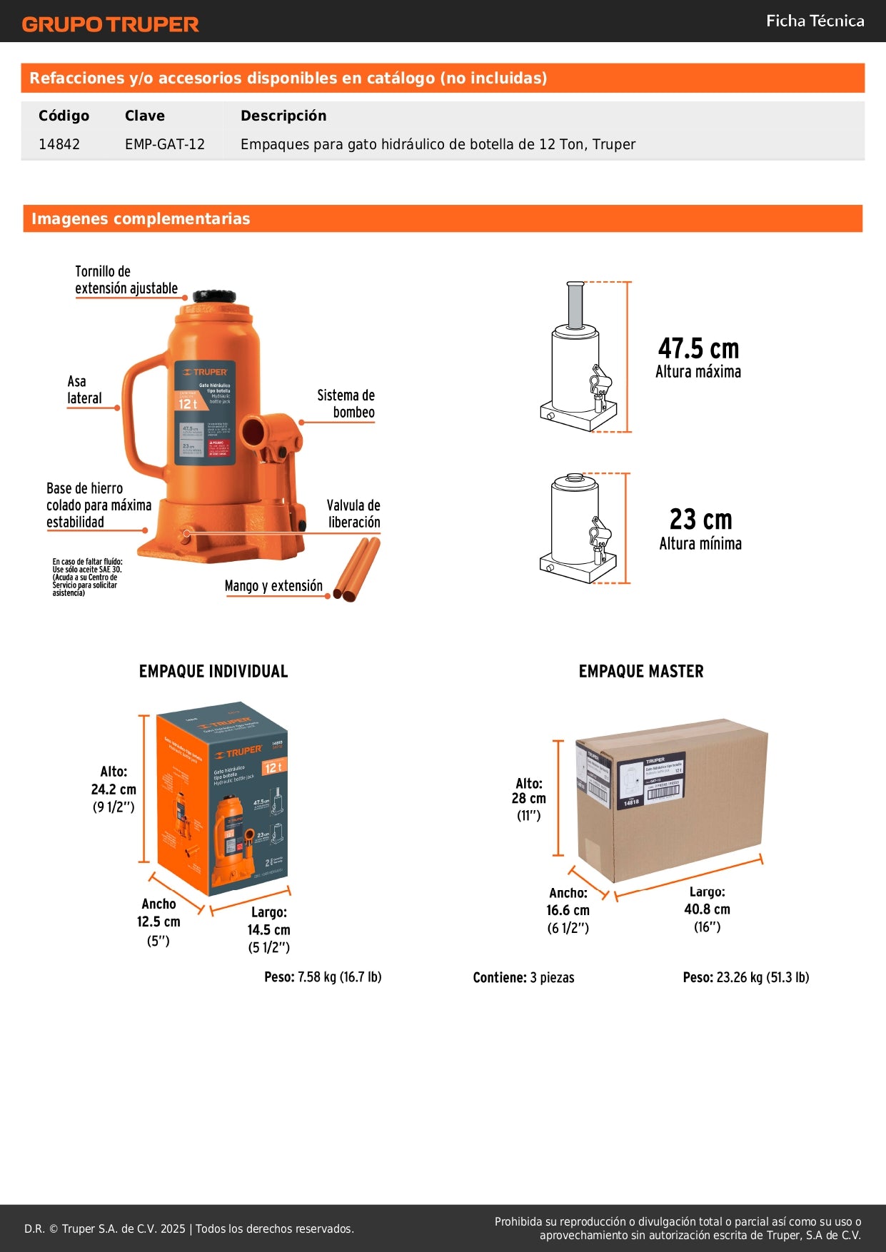 Gato Hidráulico de Botella 12 Ton Truper GAT-12 - Levantamiento Seguro de Vehículos Pesados con Base Estable