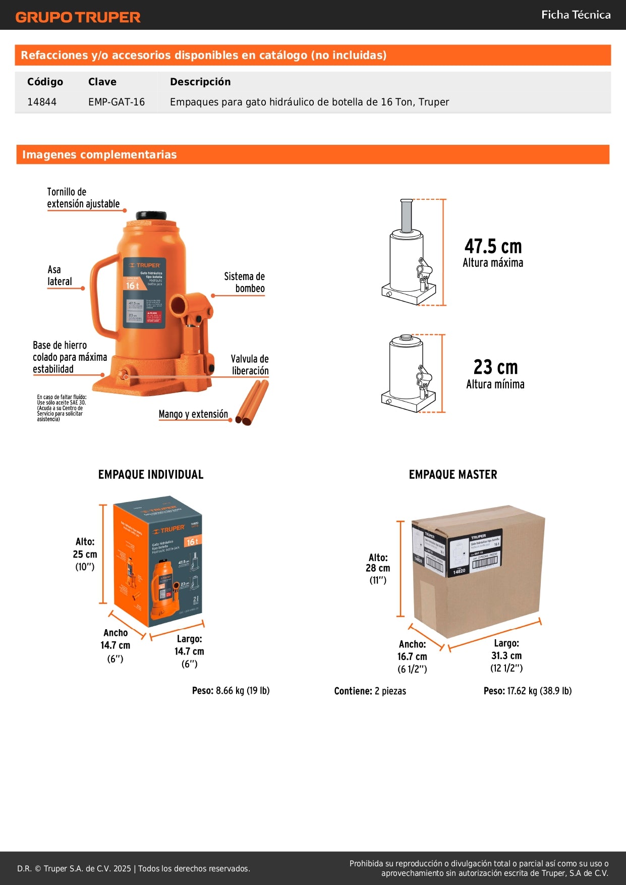 ¡Invierte en seguridad y calidad profesional! El gato hidráulico Truper GAT-16 es la herramienta confiable que necesitas para trabajos pesados en tu taller o negocio.