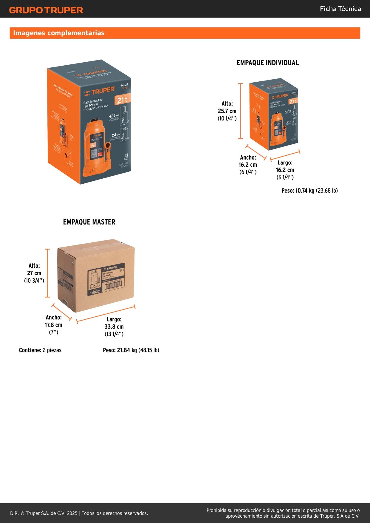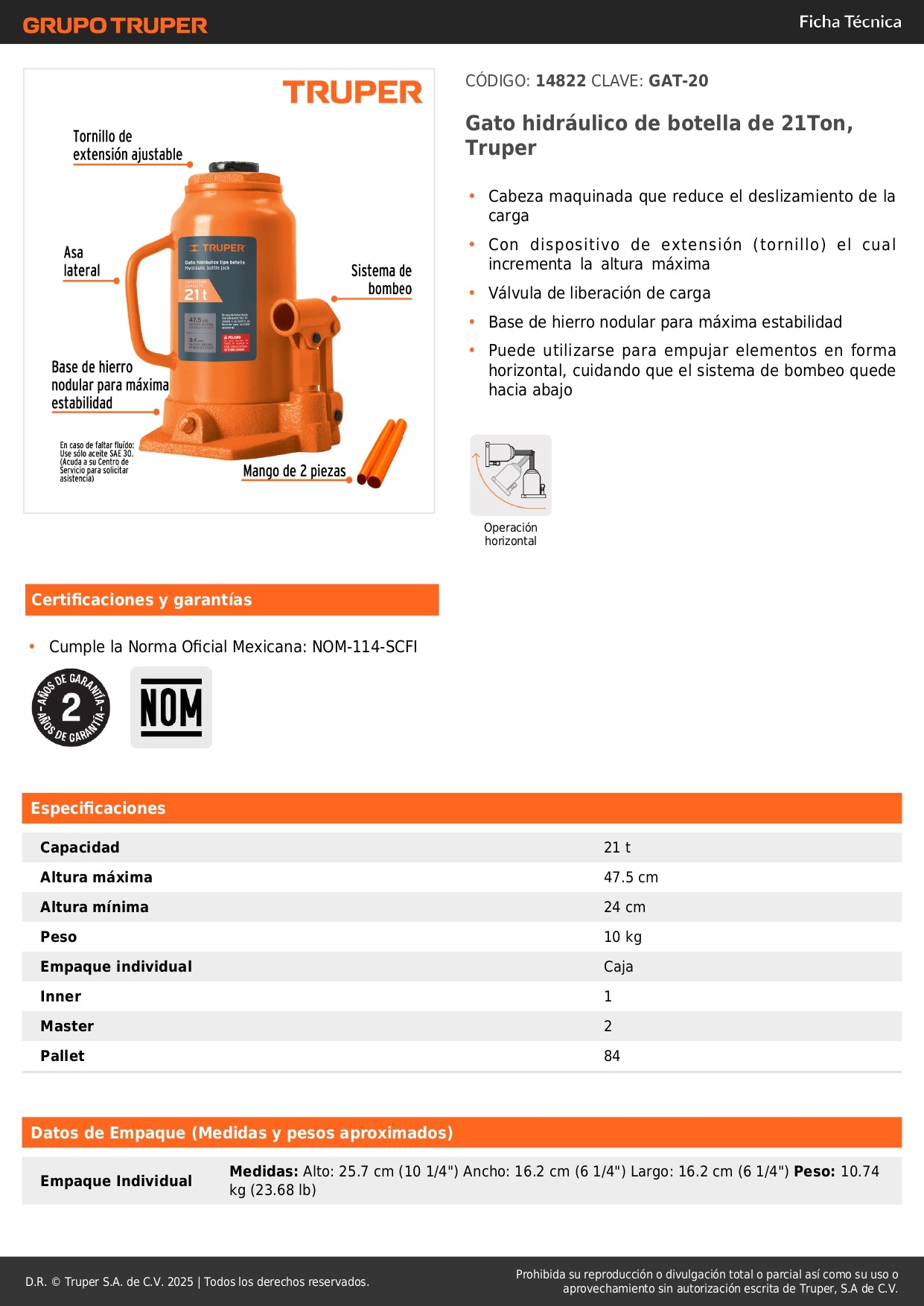 El gato hidráulico de botella Truper GAT-20 es la herramienta ideal para talleres mecánicos, servicios automotrices y trabajos industriales que requieren levantamiento de cargas pesadas hasta 21 toneladas. Diseñado con tecnología hidráulica de alta resistencia y materiales de calidad profesional.