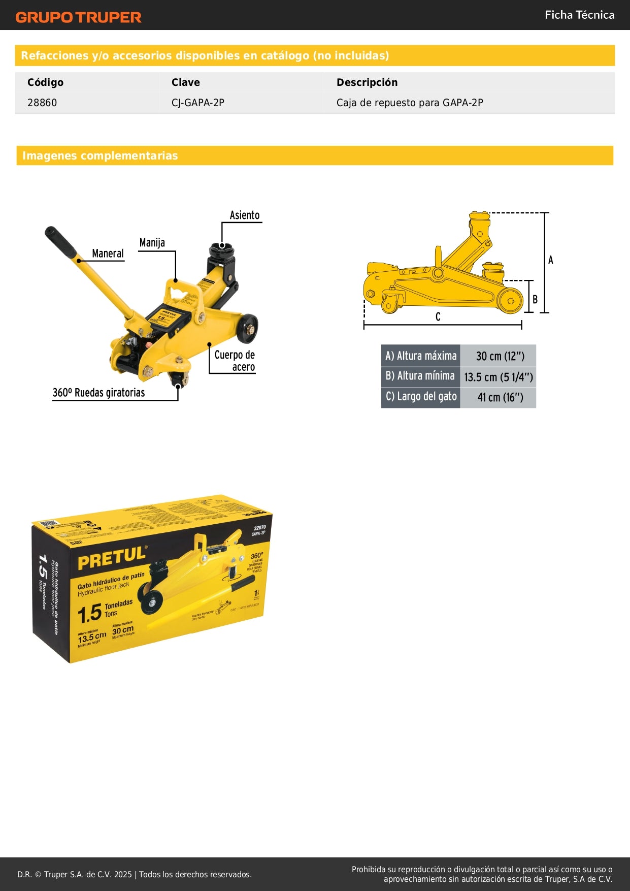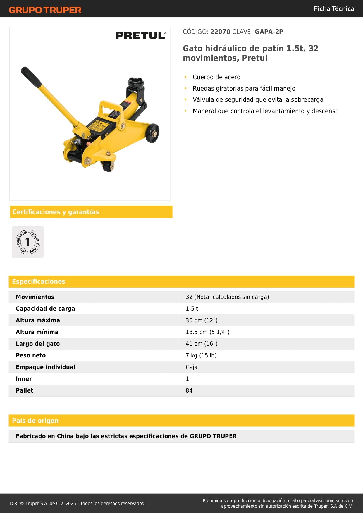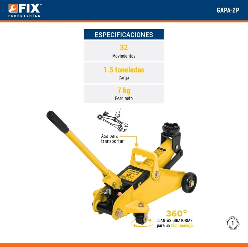Gato Hidráulico de Patín 1.5 Toneladas Pretul GAPA-2P - Levantamiento Seguro de Vehículos con 32 Movimientos y Ruedas Giratorias