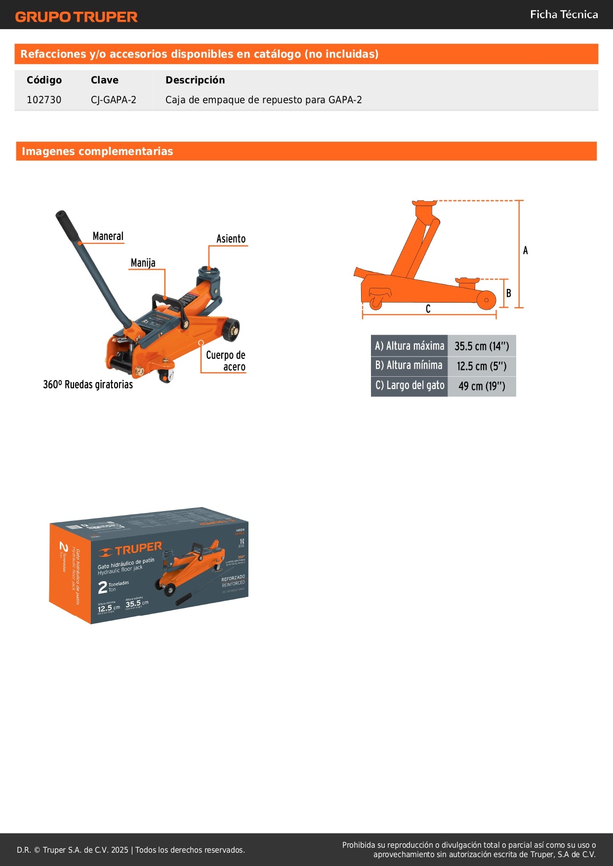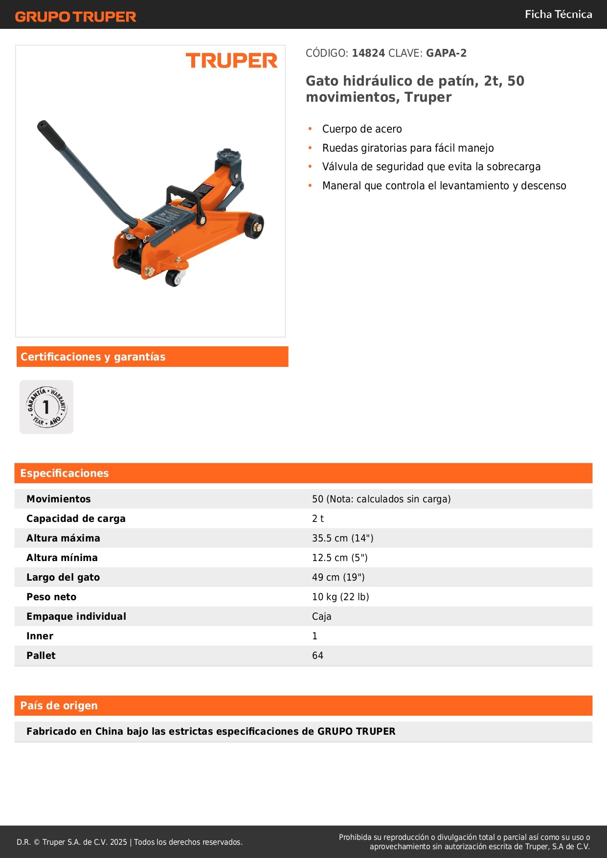 Levanta tu vehículo de forma segura y eficiente con el gato hidráulico de patín Truper GAPA-2, diseñado para talleres mecánicos profesionales y uso automotriz. Con capacidad de 2 toneladas (4,400 lbs), este gato tipo lagarto es ideal para cambio de llantas, mantenimiento de frenos y reparaciones bajo el vehículo.