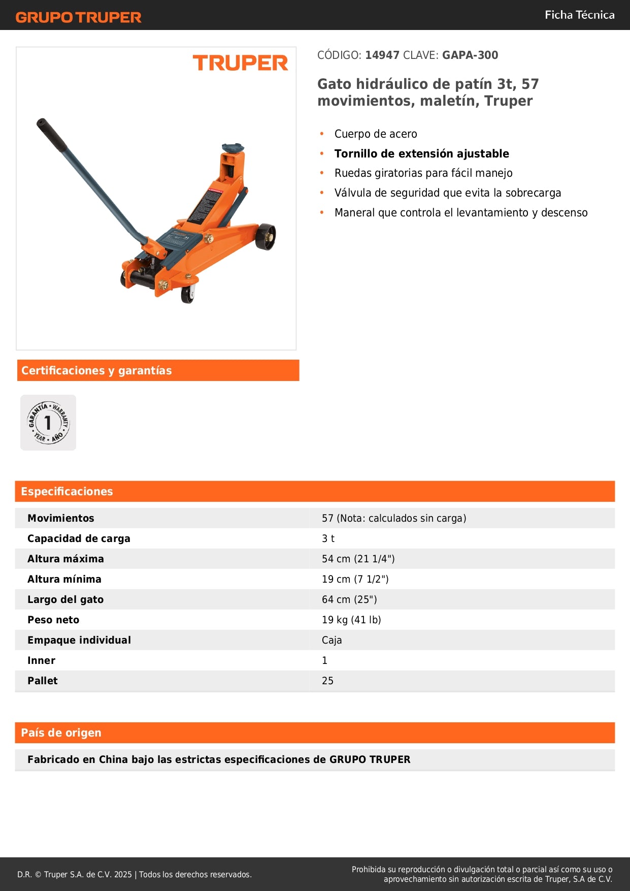 Modelo GAPA-300 | Capacidad máxima: 3 ton | Sistema: Hidráulico | Marca: TRUPER | Incluye: Maletín portátil