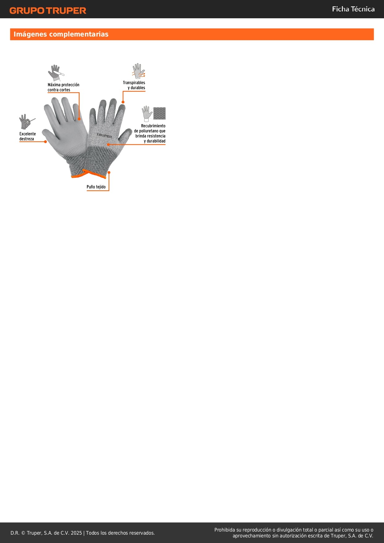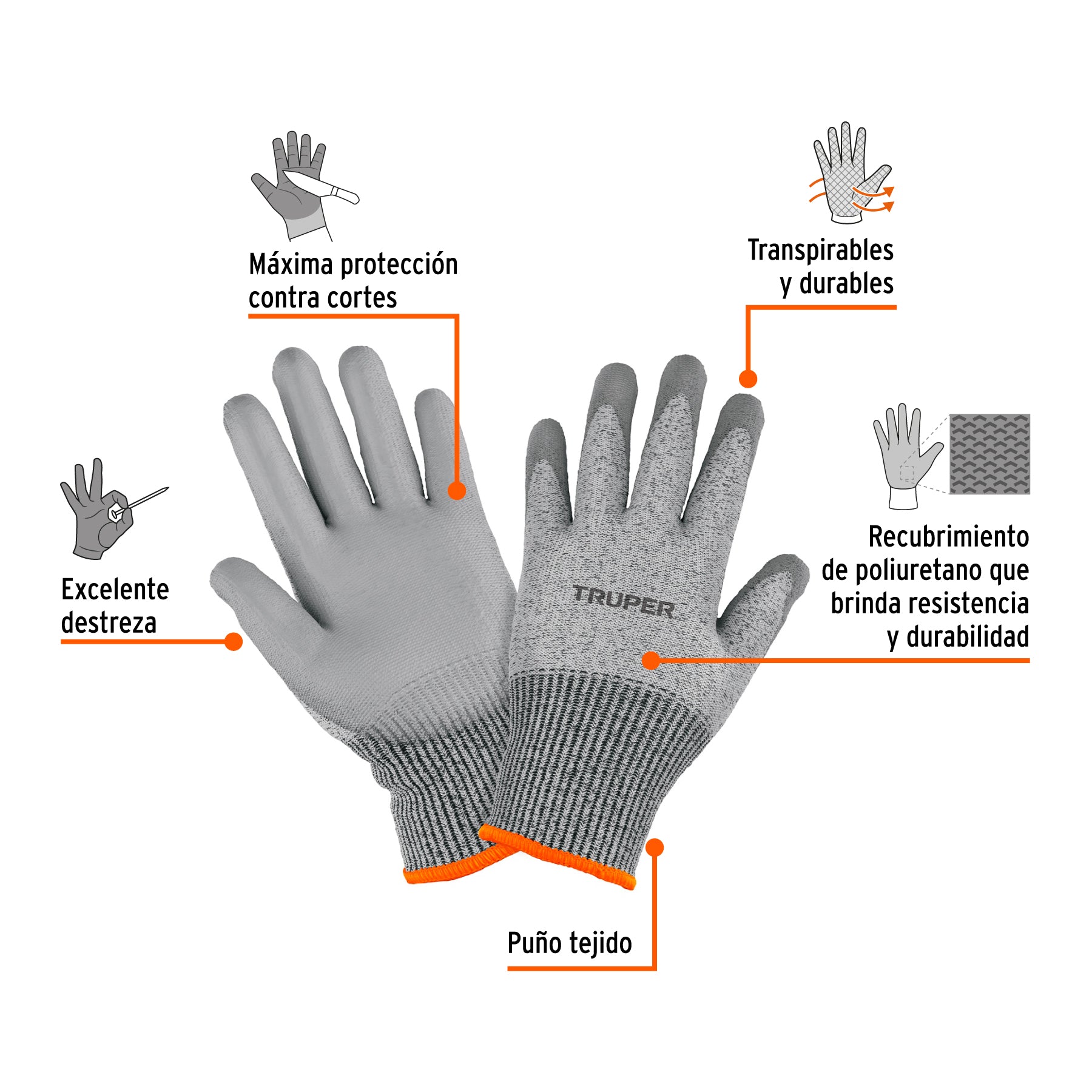 - Recubrimiento de Poliuretano: Excelente agarre en superficies secas y húmedas