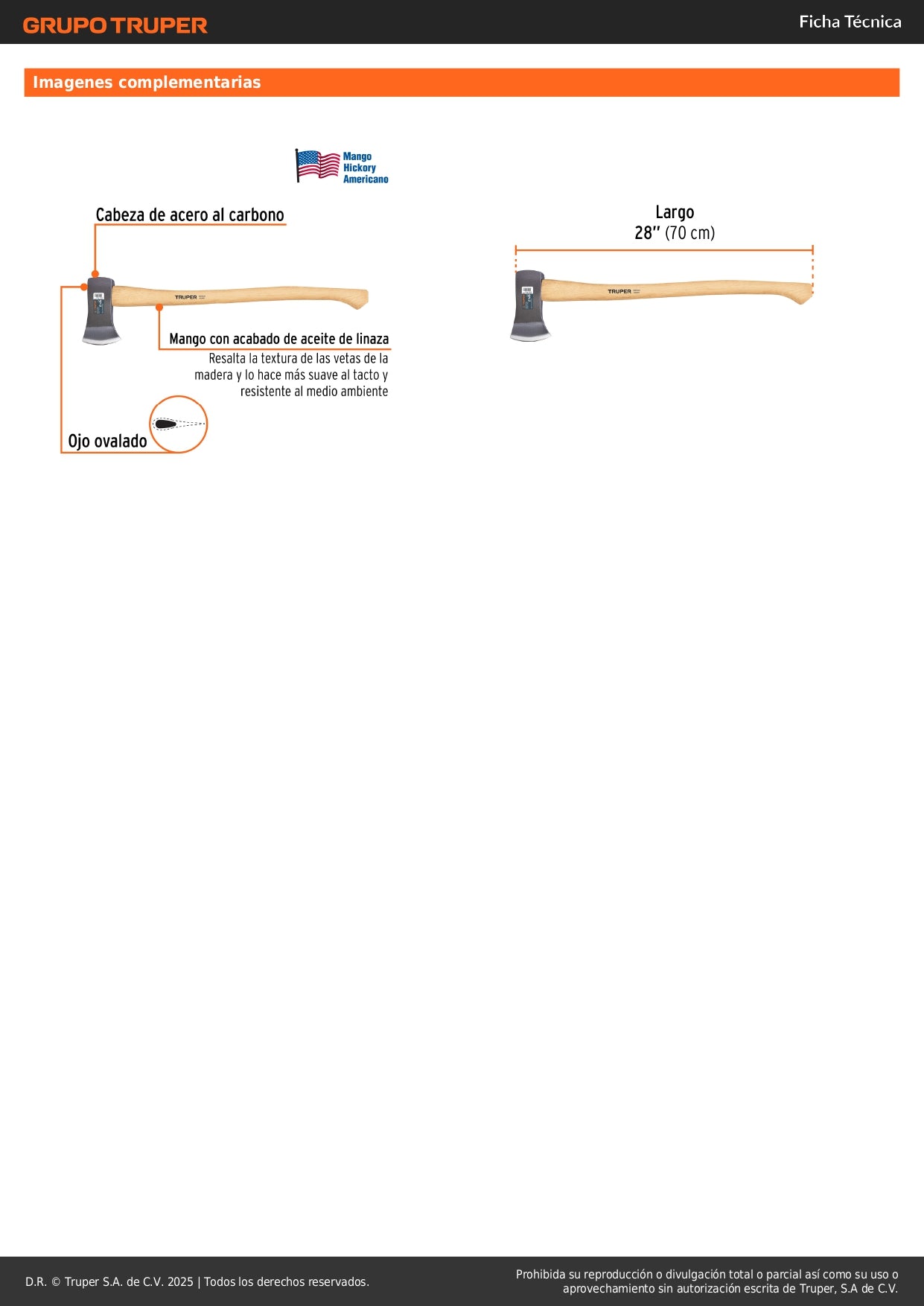 - Mango de madera hickory natural de 28" - material tradicional conocido por su resistencia y absorción de impactos