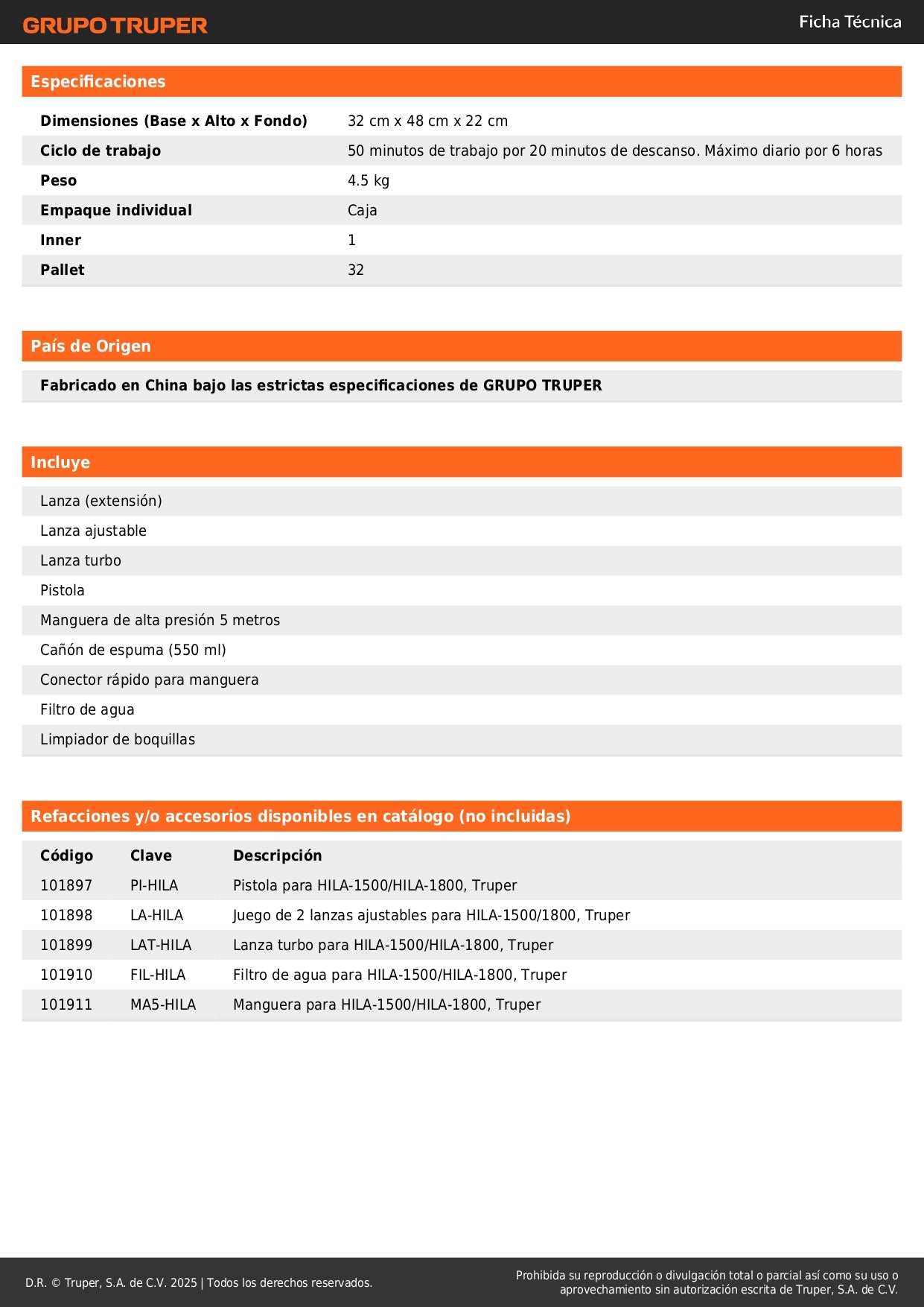 | Largo de Manguera | 5 metros (Alta Presión) |