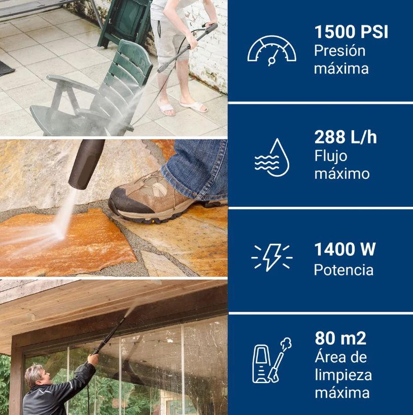 - Ideal para el Hogar: Su ciclo de trabajo y potencia de 1500 PSI son perfectos para tareas de limpieza doméstica sin requerir equipos industriales.