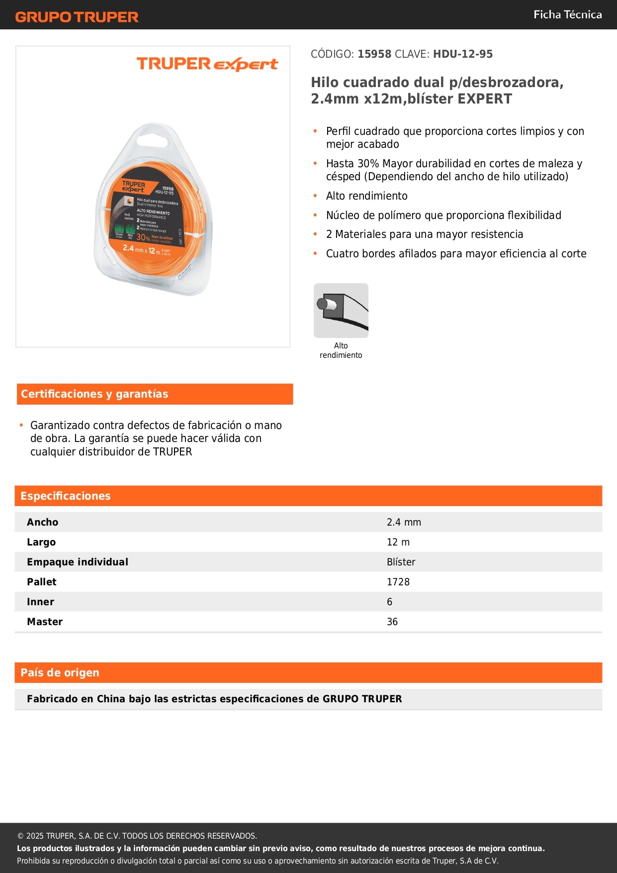 Hilo Cuadrado Dual para Desbrozadora EXPERT - Máximo Rendimiento