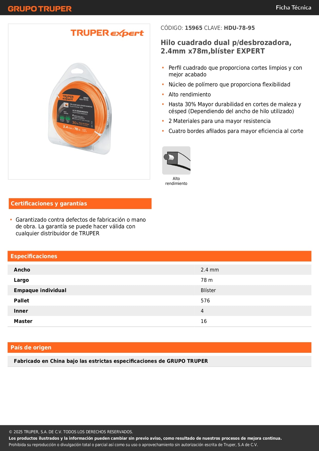 El hilo cuadrado dual EXPERT de 2.4mm x 78m es la solución profesional para tu desbrozadora. Diseñado con tecnología de corte dual, este hilo para desbrozadora ofrece un desempeño superior en trabajos de jardinería y mantenimiento de áreas verdes.