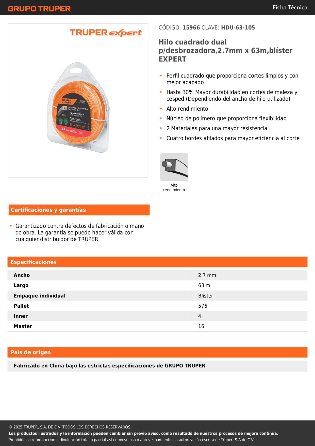 - Diámetro 2.7mm: Grosor ideal para trabajos medianos y pesados en maleza, pasto y vegetación densa