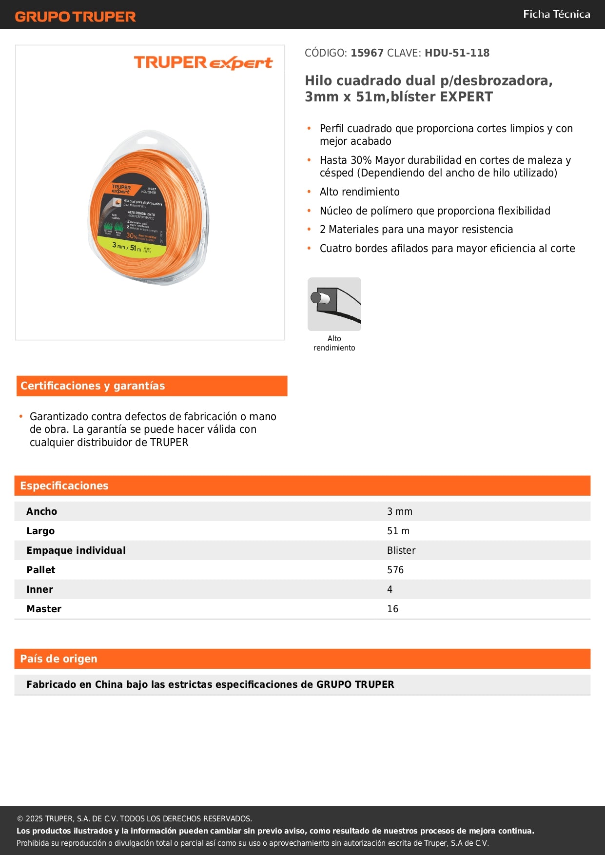 Hilo profesional de alto rendimiento diseñado para desbrozadoras y recortadoras de césped. El hilo cuadrado dual EXPERT de TRUPER® ofrece un corte preciso y duradero en trabajos de jardinería y mantenimiento de áreas verdes.