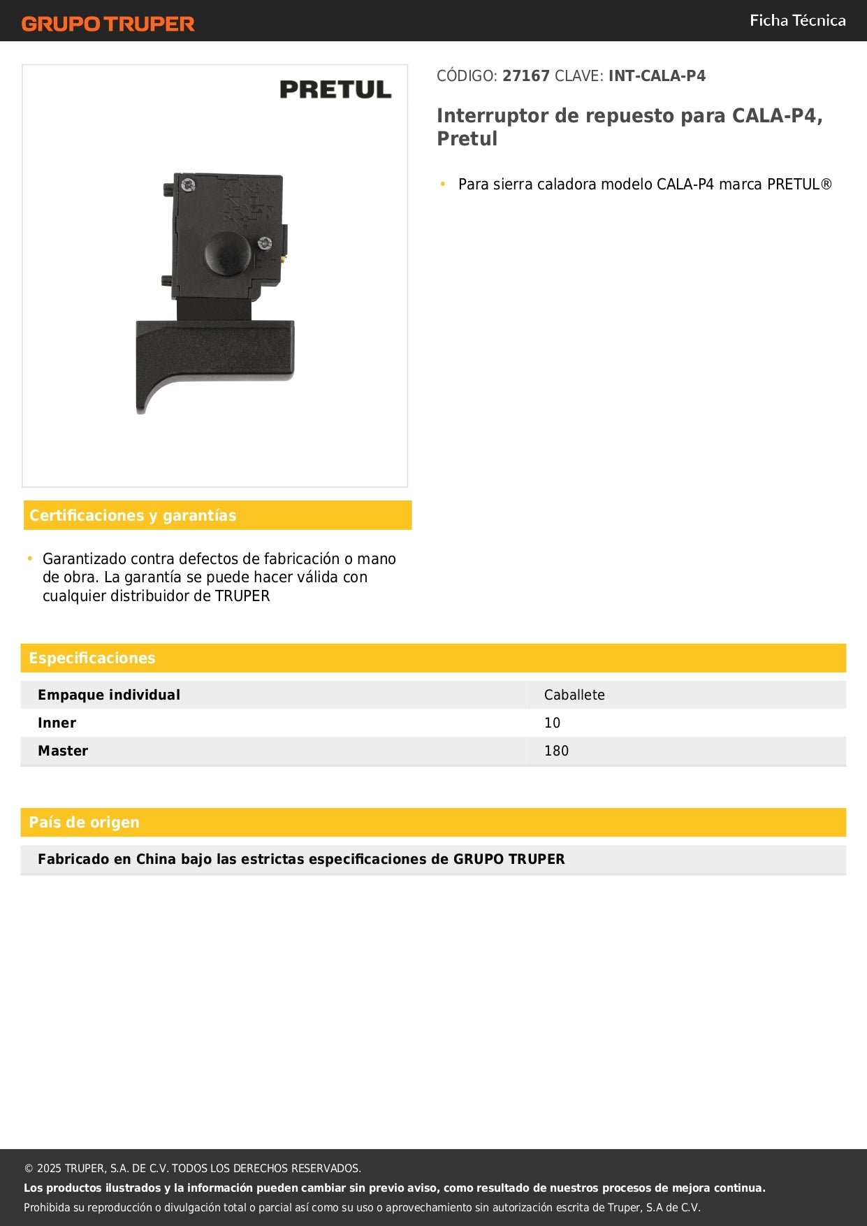 Interruptor de repuesto para CALA-P4, Pretul