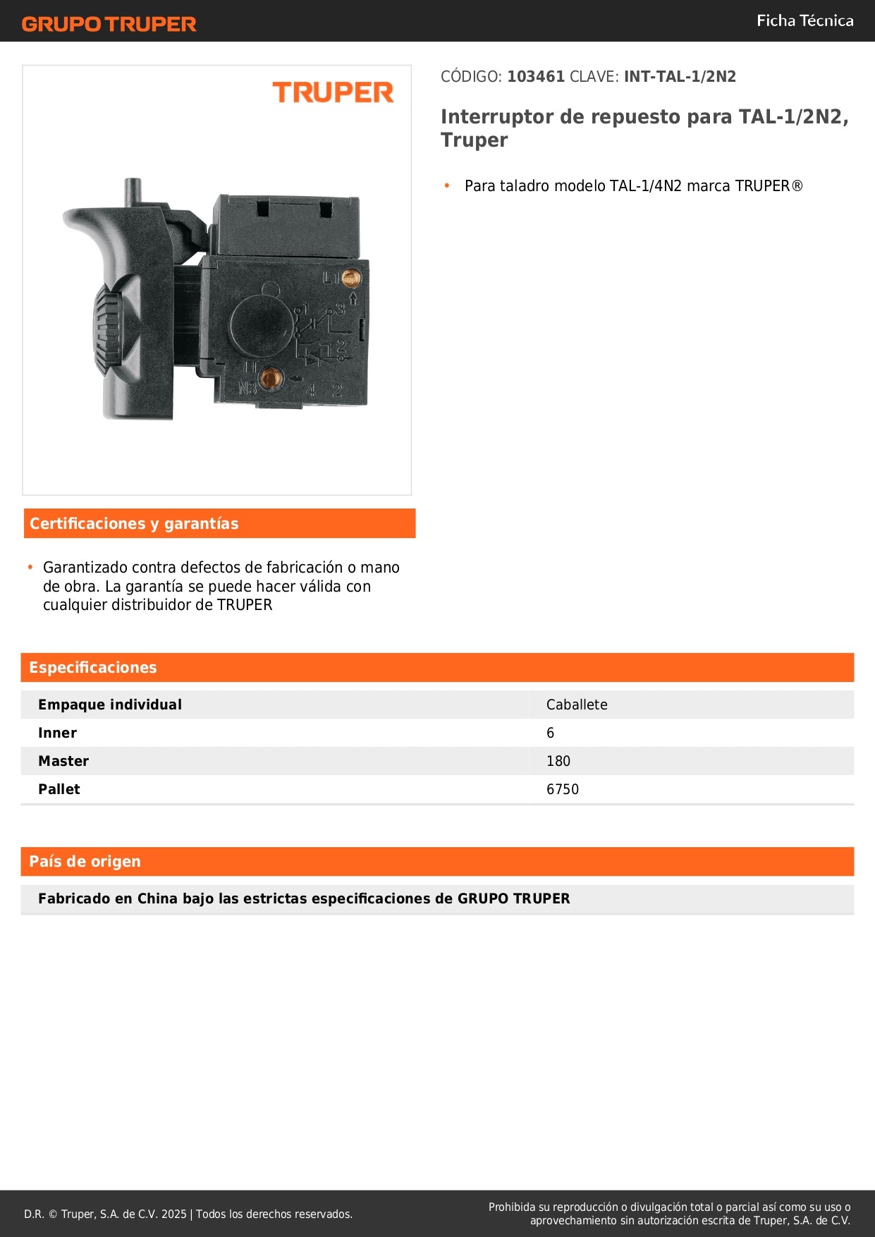 Repuesto original Truper diseñado específicamente para taladros modelo TAL-1/2N2. Este interruptor de encendido y apagado garantiza el funcionamiento seguro y eficiente de tu herramienta eléctrica.