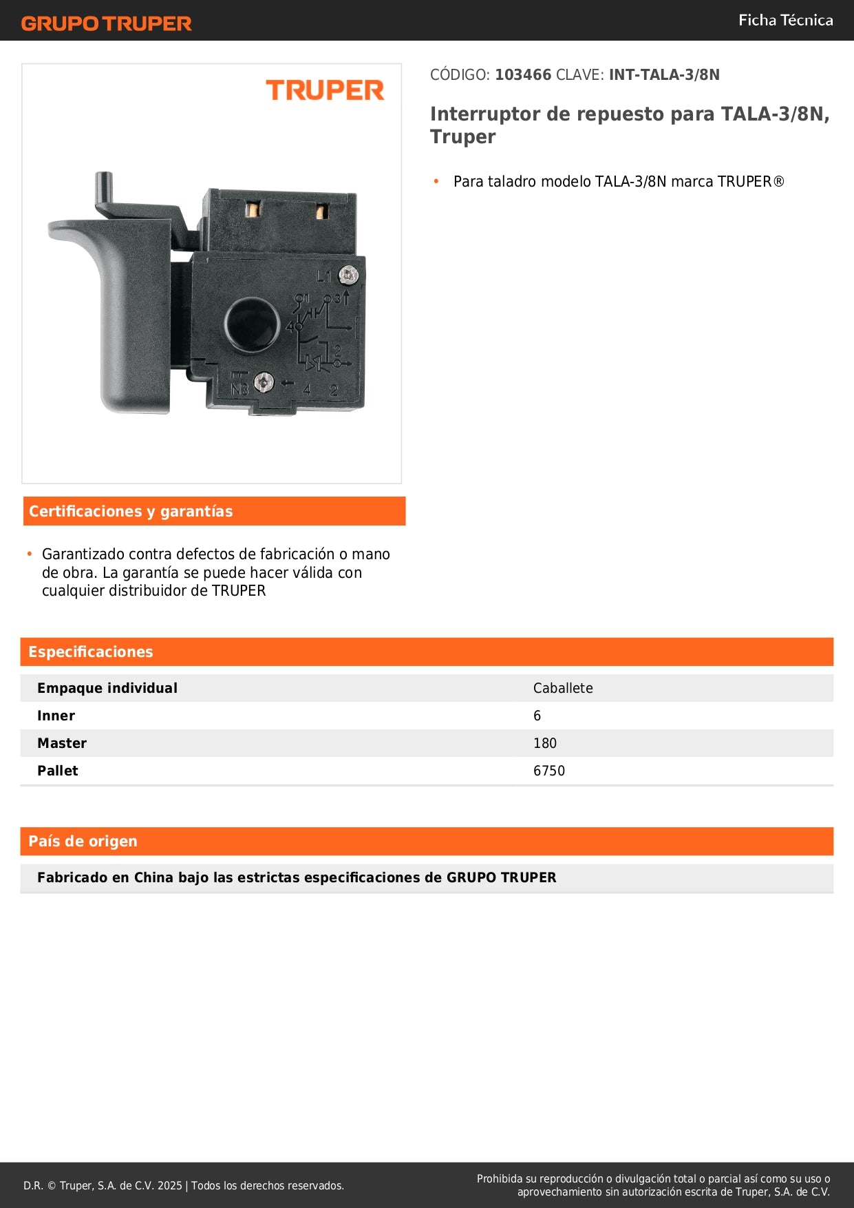 Repuesto original Truper diseñado específicamente para taladros modelo TALA-3/8N. Este interruptor de repuesto garantiza el funcionamiento óptimo de tu herramienta eléctrica.