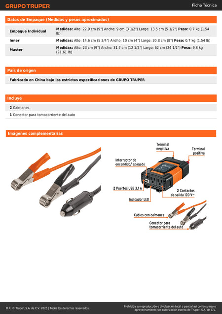 Inversor de Corriente 12V a 120V 200W Truper INCO-200 con USB - Solución Portátil para Alimentar Equipos Electrónicos en Vehículos