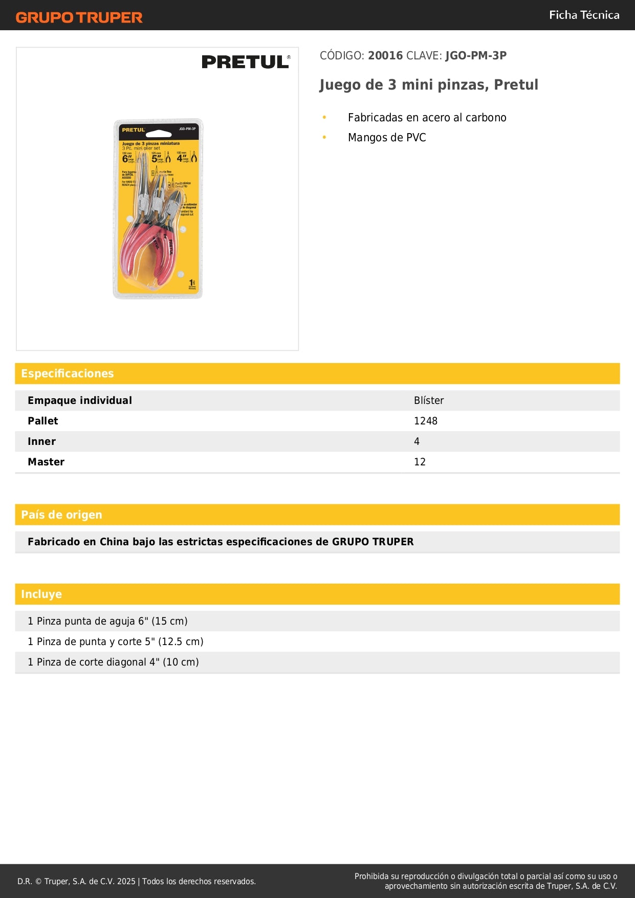 Este juego de 3 mini pinzas Pretul está diseñado especialmente para trabajos que requieren máxima precisión y control. Fabricadas en acero al carbono de alta resistencia con mangos ergonómicos de PVC antideslizante, estas pinzas son la herramienta ideal para profesionales y aficionados.