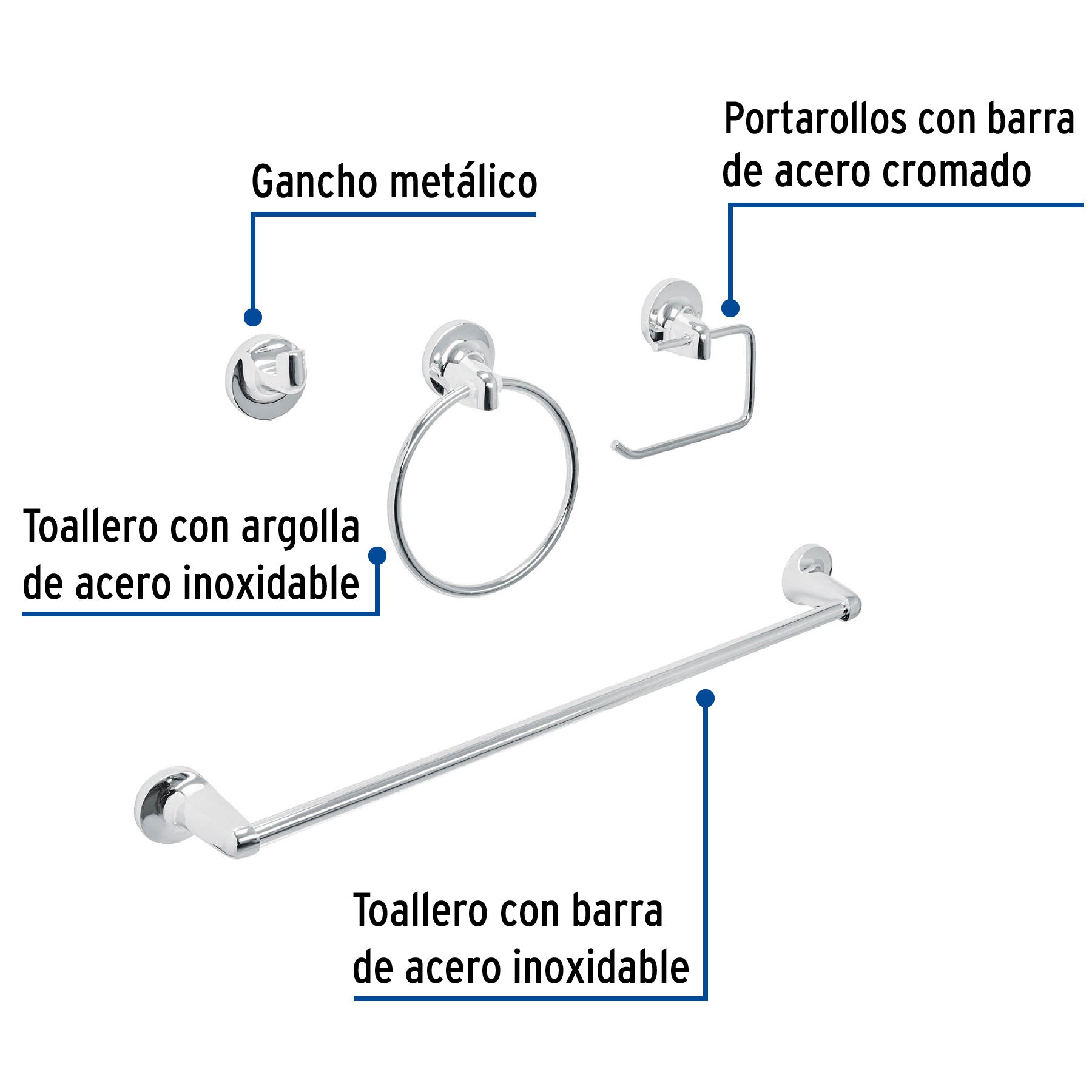 - Set Completo 4 Piezas: Incluye toallero, portarrollos, gancho perchero y anillo toallero