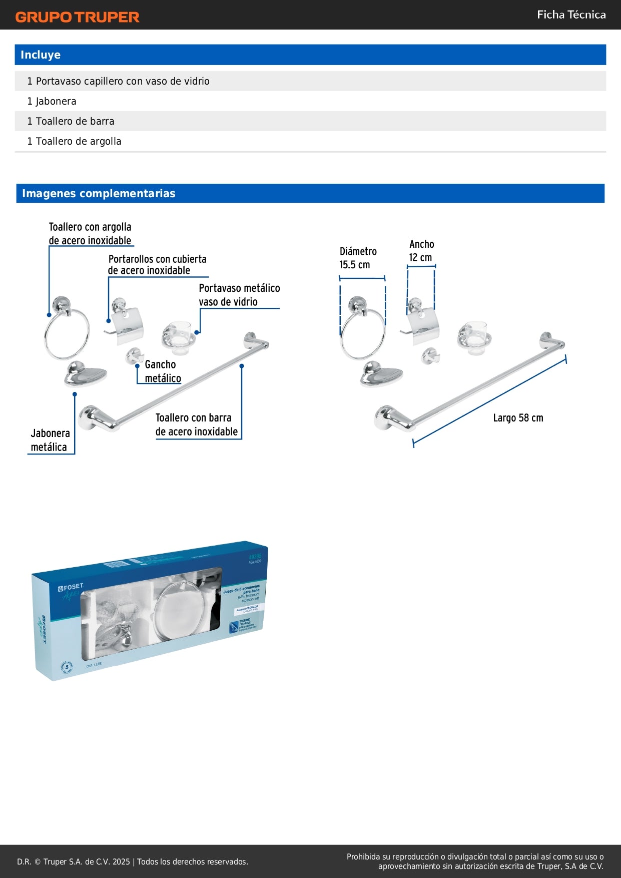 Transforma tu baño con este set completo de accesorios de acero inoxidable de alta calidad. El juego FOSET AQUA AQA-4000 incluye todo lo necesario para organizar y modernizar tu espacio de baño con estilo profesional.
