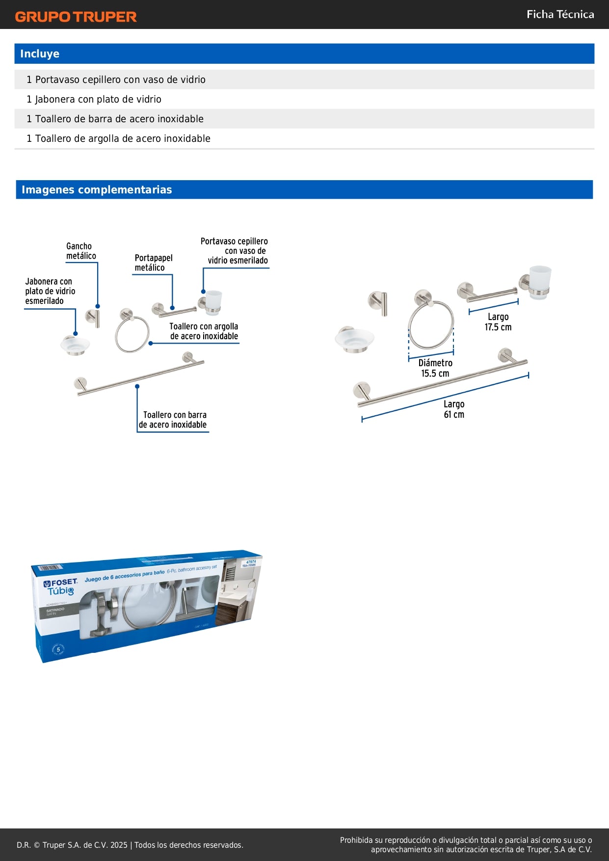 Transforma tu baño con este set profesional de 6 piezas fabricado en acero inoxidable de alta calidad. El juego FOSET TÚBIG TBA-7000N combina durabilidad, funcionalidad y diseño moderno para organizar y embellecer tu espacio.