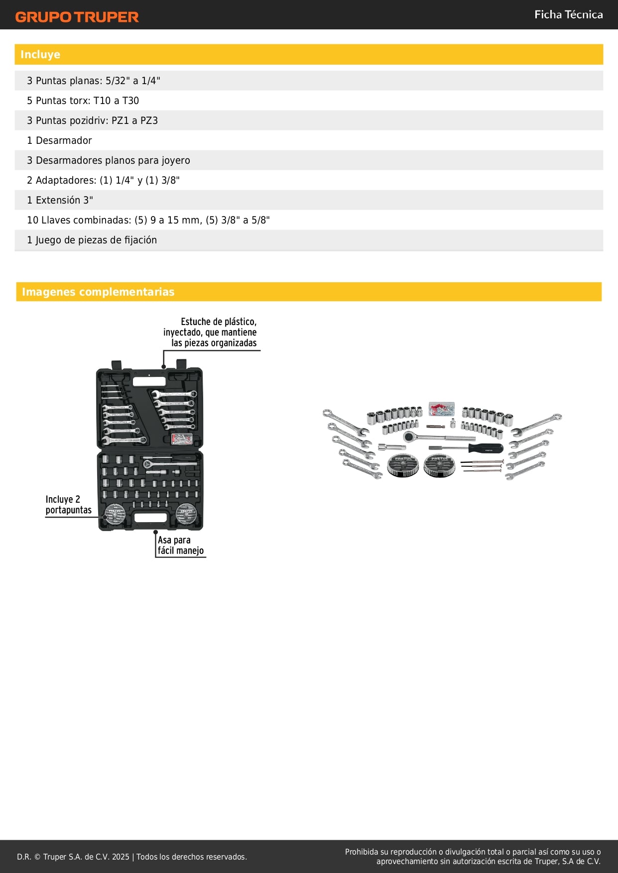 Dados milimétricos y pulgadas, carraca 1/4", carraca 3/8", extensiones, adaptador universal, destornilladores de precisión y accesorios complementarios. Todas las piezas están fabricadas con materiales de alta resistencia y acabado cromado anticorrosivo.
