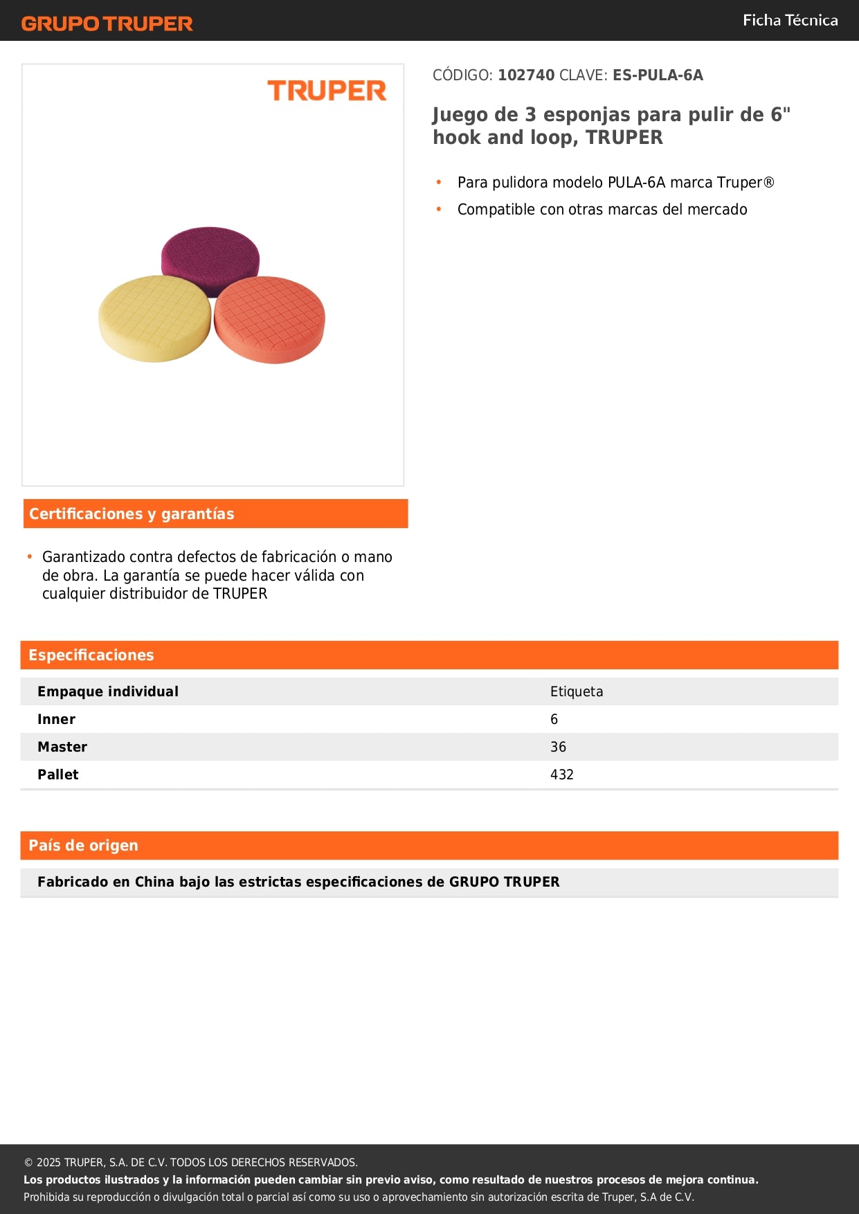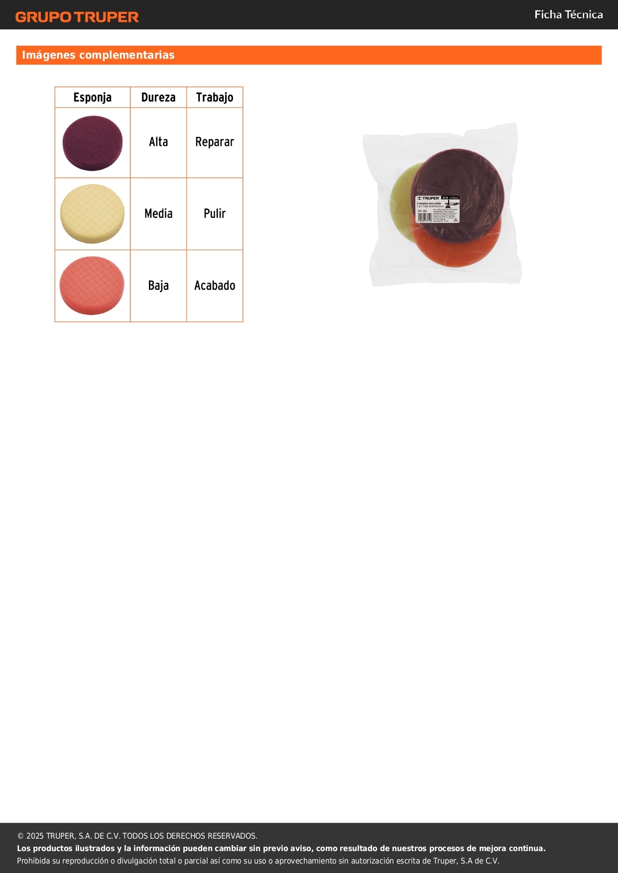 ¿Por qué elegir estas esponjas TRUPER? Fabricadas con materiales de alta densidad que garantizan durabilidad y resultados profesionales. El sistema hook and loop permite cambios rápidos entre esponjas, optimizando tu tiempo de trabajo. Compatibles con pulidoras de 6" estándar del mercado.