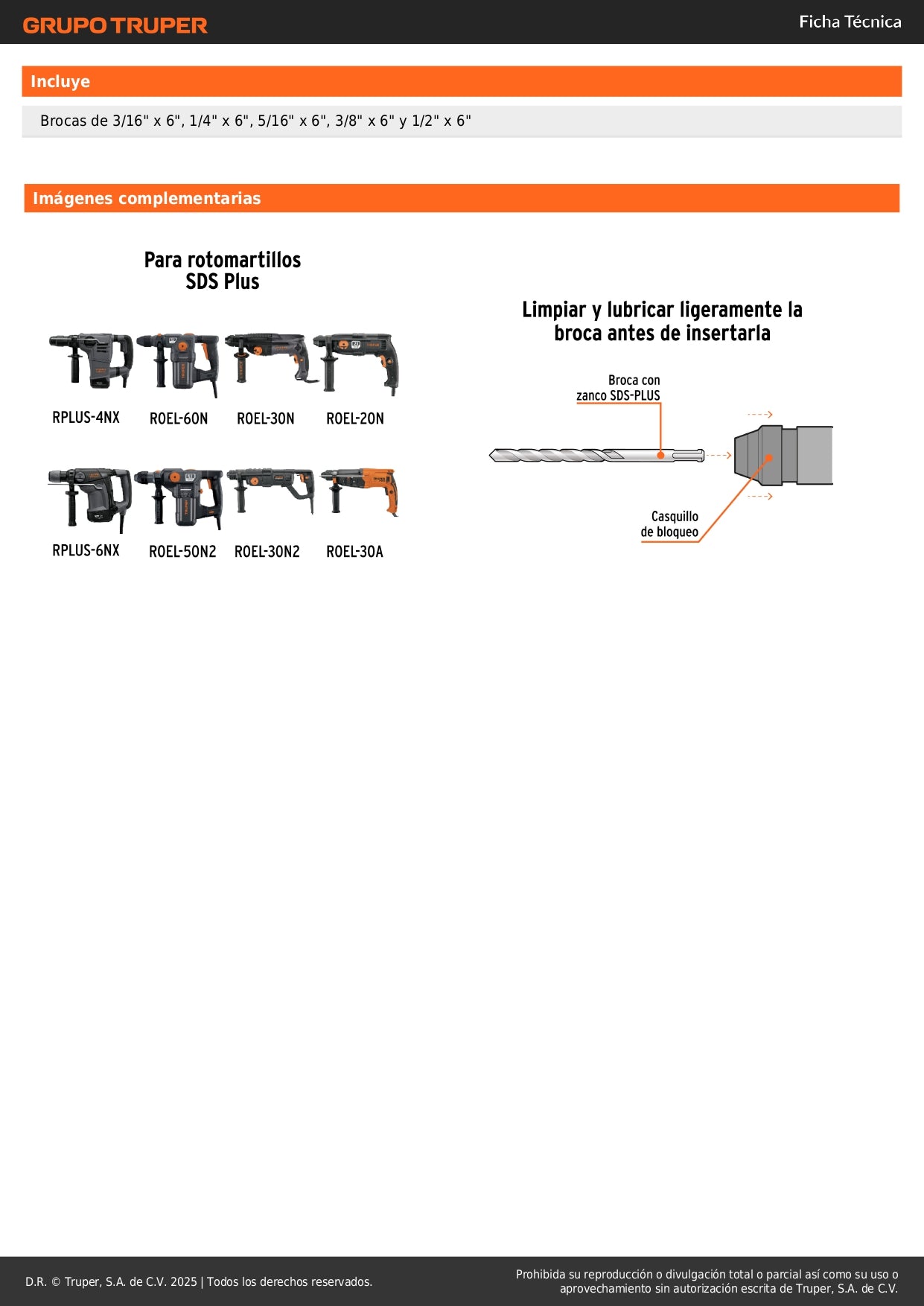 - Sistema SDS Plus: Encaje rápido y seguro compatible con rotomartillos y taladros percutores