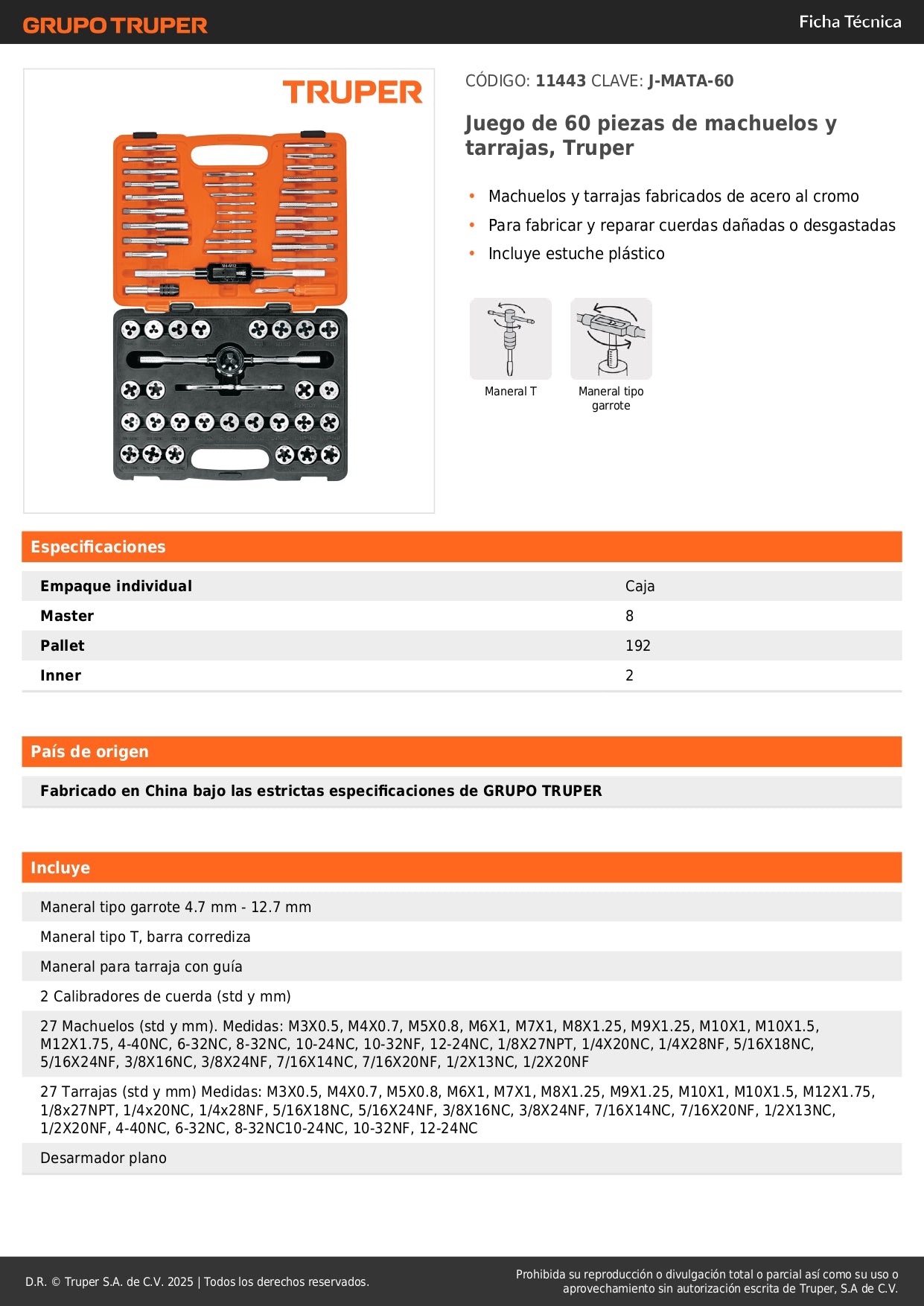 El juego de machuelos y tarrajas J-MATA-60 de Truper es la solución profesional completa para reparar roscas dañadas y fabricar cuerdas nuevas en trabajos de mecánica, plomería y mantenimiento industrial.