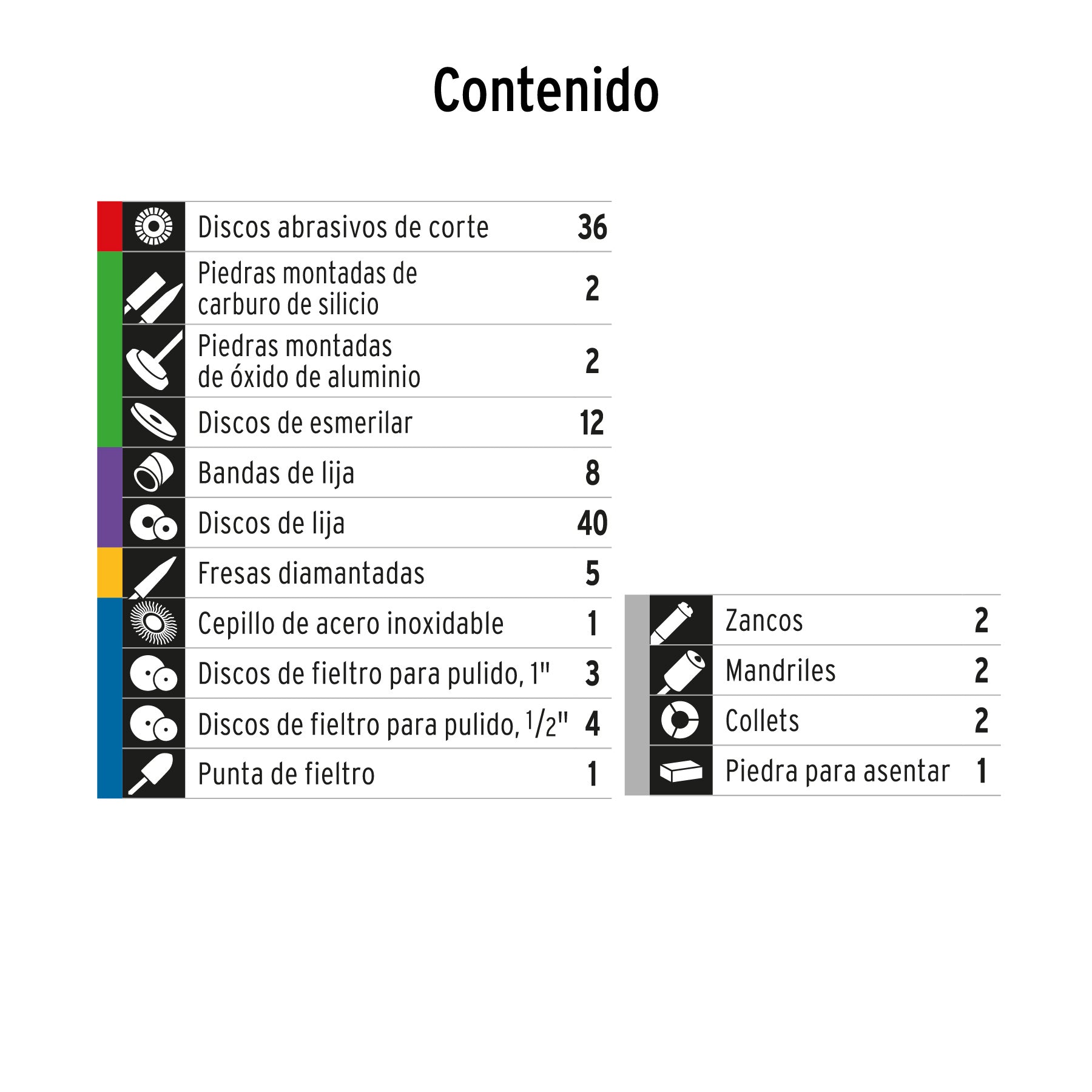- Incluye discos de corte, piedras de esmeril, cepillos de alambre, fresas, lijas y puntas de pulido