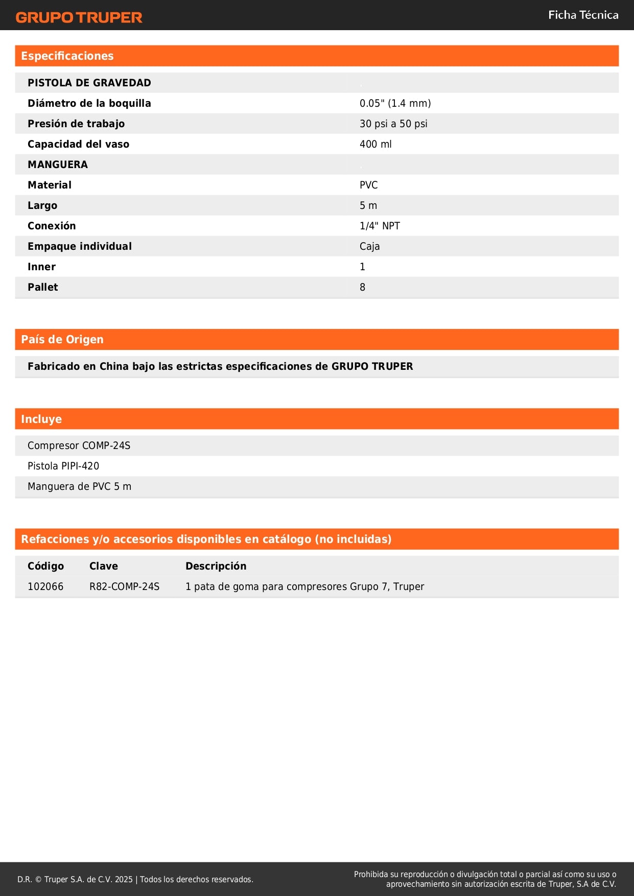 Este kit compresor de aire TRUPER incluye todo lo necesario para iniciar tus proyectos de pintura y trabajos con herramientas neumáticas. Con motor de 2 2/3 HP y tecnología libre de aceite, garantiza un aire limpio y sin contaminantes, ideal para aplicaciones de pintura de alta calidad.