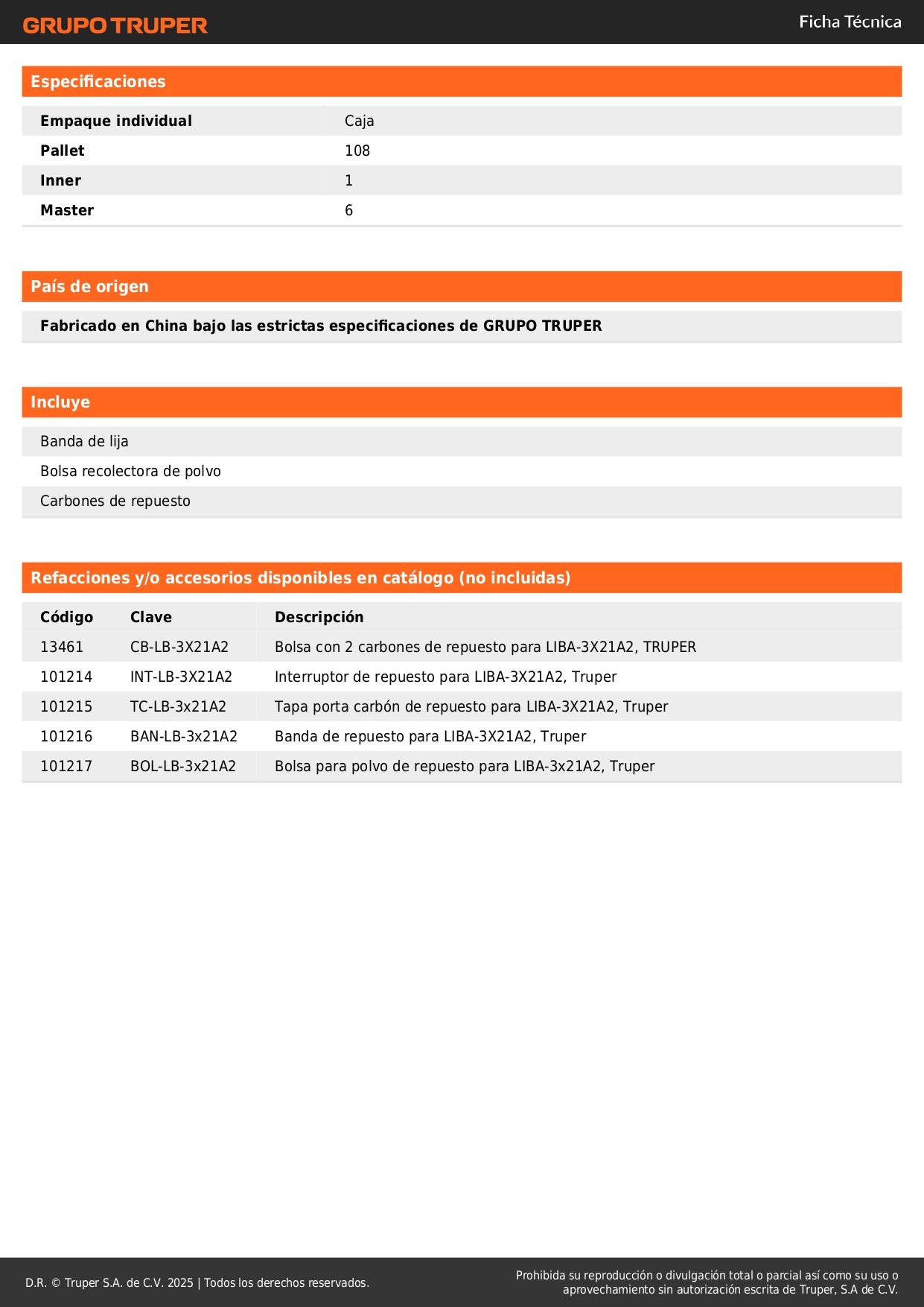 Incluye: Lijadora de banda, bolsa recolectora de polvo, manual de usuario y garantía TRUPER.