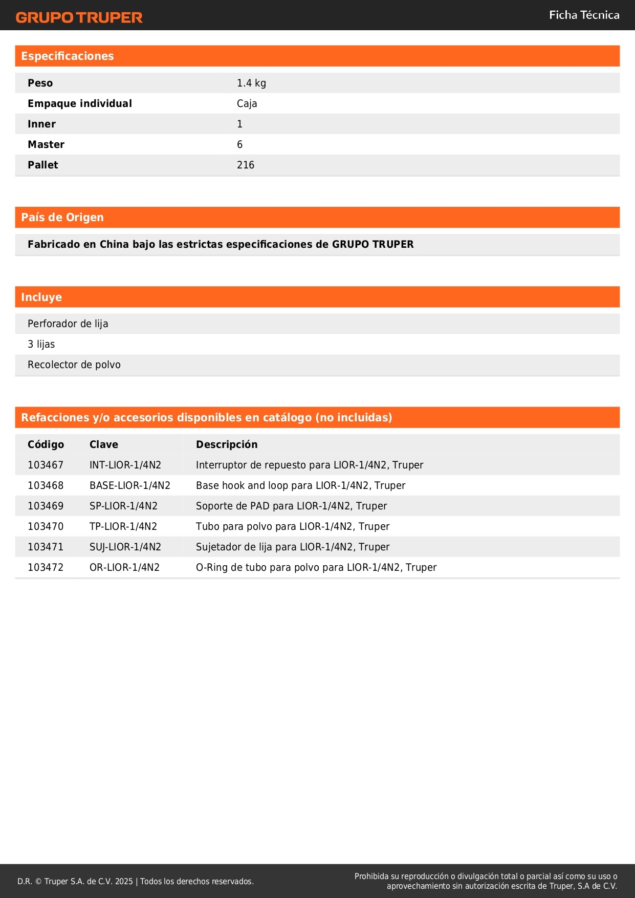 Lijadora Orbital 1/4 Hoja TRUPER LIOR-1/4N2 - Potencia y Precisión Profesional