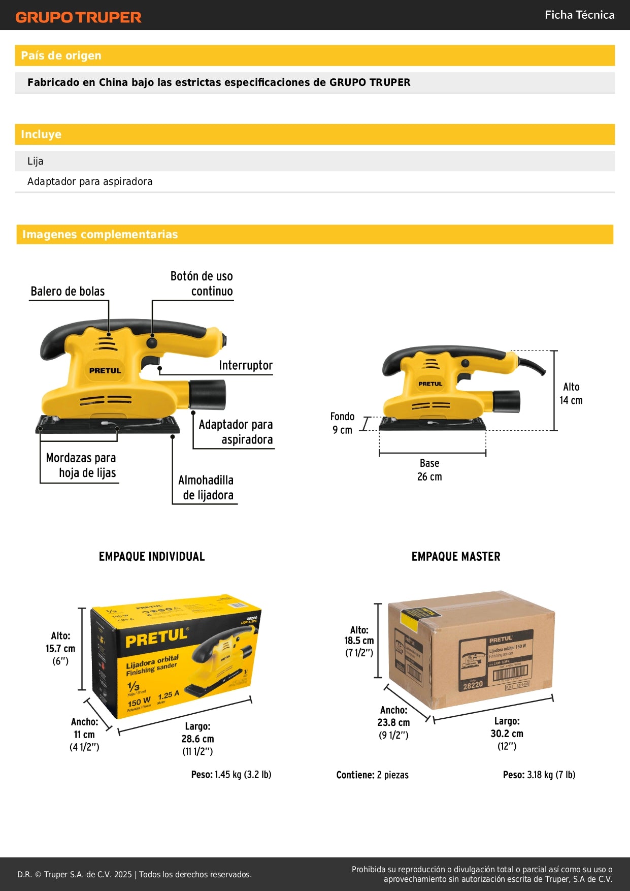 Calidad profesional, durabilidad garantizada, fácil cambio de lija, bajo nivel de vibración para trabajo prolongado. Herramienta eléctrica confiable respaldada por la marca PRETUL, líder en herramientas para hogar y taller.