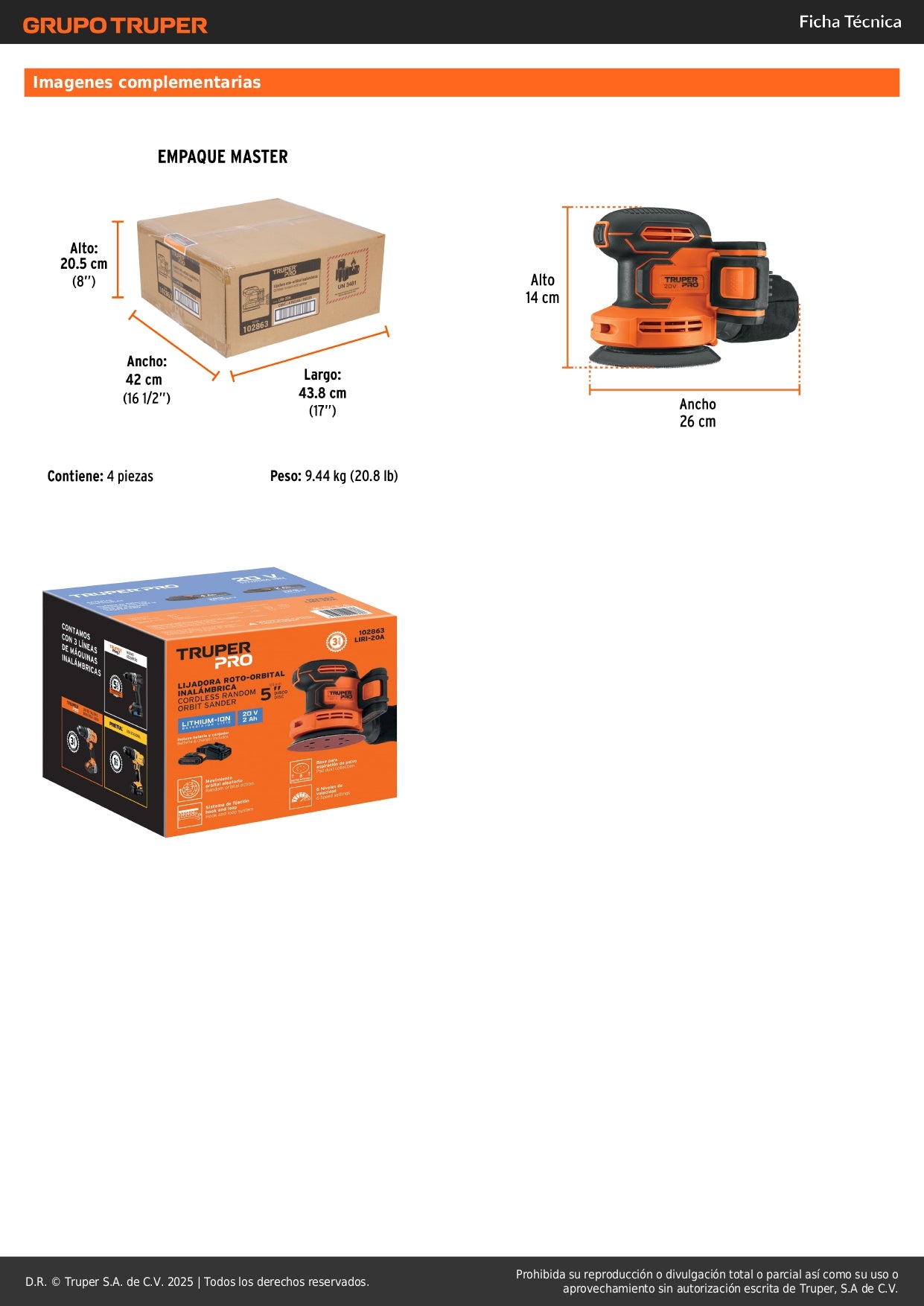 Incluye: Lijadora LIRI-20A, Batería 20V 2Ah, Cargador, Manual de Usuario