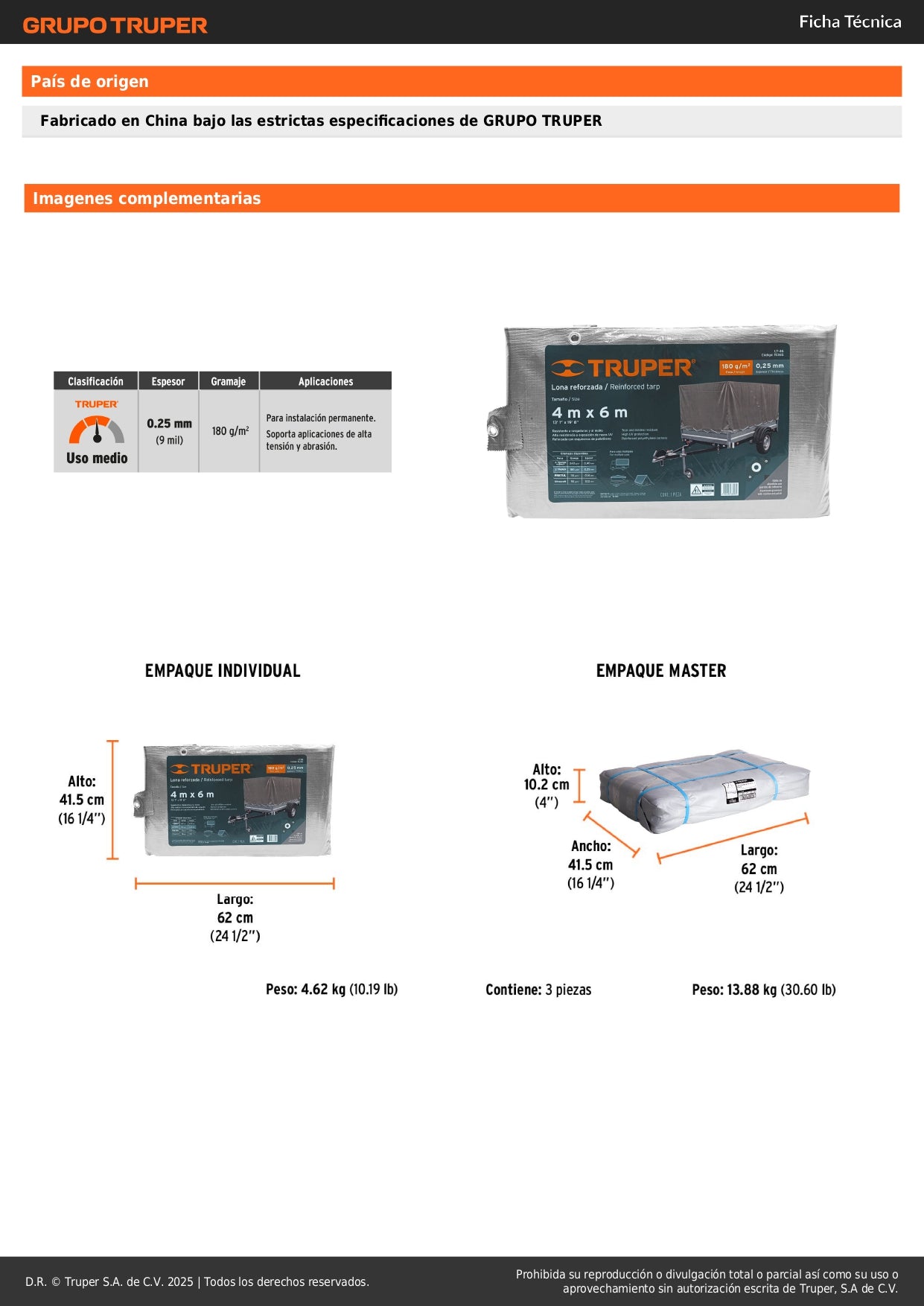 Marca líder en herramientas y productos para construcción en México, TRUPER garantiza calidad profesional y durabilidad comprobada. Esta lona está diseñada para resistir las condiciones más exigentes del trabajo en obra y uso industrial.