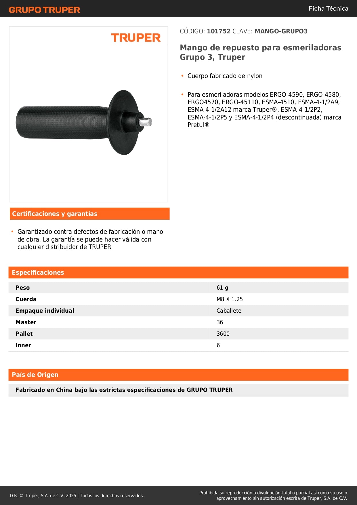 Mango de Repuesto para Esmeriladora Truper - Grupo 3