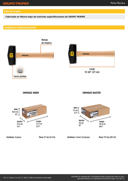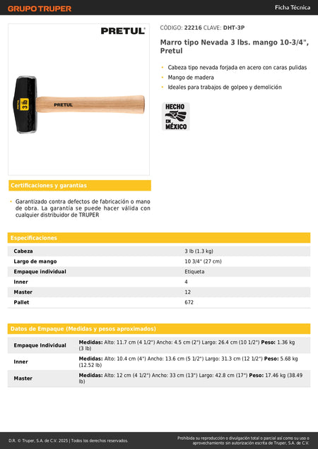 Marro Nevada 3 lbs Pretul DHT-3P - Martillo Demolición Profesional Mango Madera 10-3/4