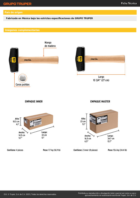 Marro Nevada 4 lbs Pretul DHT-4P - Herramienta Profesional para Demolición y Golpeo con Mango Madera 10-3/4"