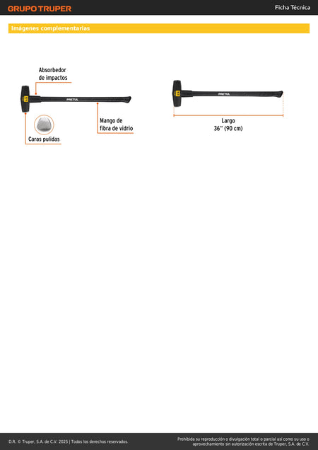 Marro Nevada 6 lbs Mango Fibra Vidrio 36 Pulgadas - Herramienta Demolición Profesional Pretul MD-6MP