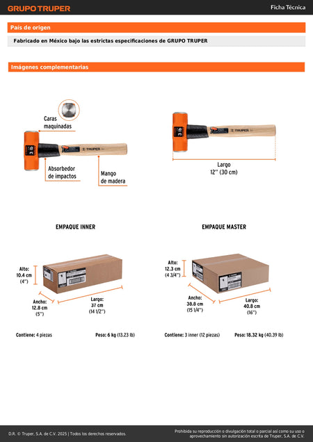 Marro Octagonal 3 lb Truper MD-3M - Cabeza Forjada Acero - Mango Madera 12 Pulgadas - Herramienta Demolición Profesional