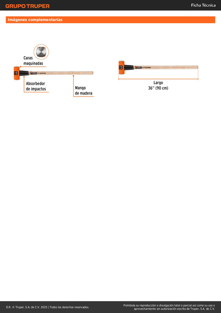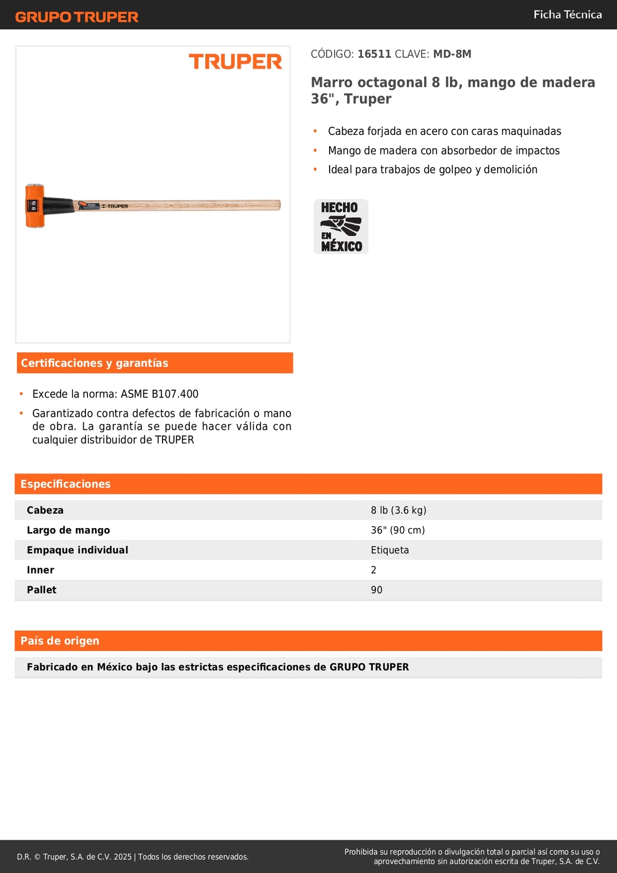 Marro Octagonal 8 lb Truper MD-8M - Herramienta Profesional para Demolición y Golpeo Pesado con Mango 36 Pulgadas