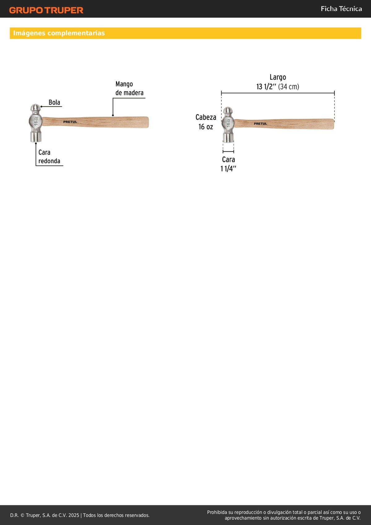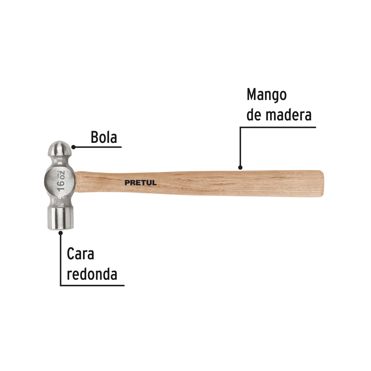 Martillo de Bola 16 oz Pretul MB-16P - Acero al Carbono con Mango de Madera - Herramienta Profesional para Trabajos de Precisión y Acabados