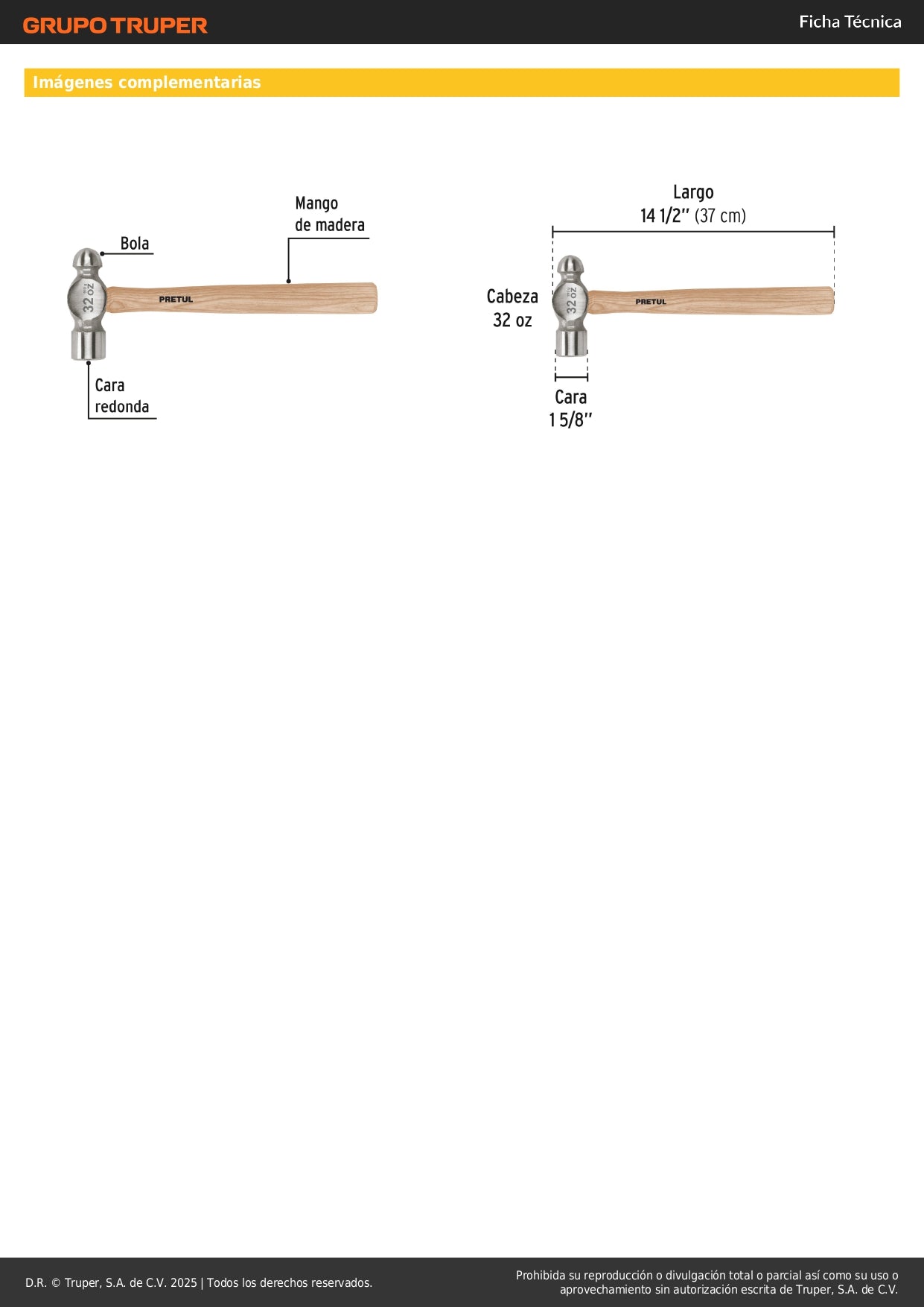 Martillo de Bola 32 oz Pretul MB-32P - Herramienta Profesional para Construcción