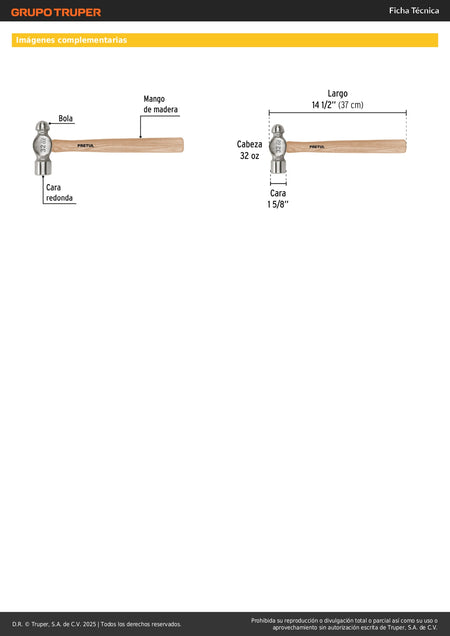 Martillo de Bola 32 oz Pretul MB-32P - Cabeza Acero Carbono Mango Madera - Herramienta Profesional Construcción Carpintería