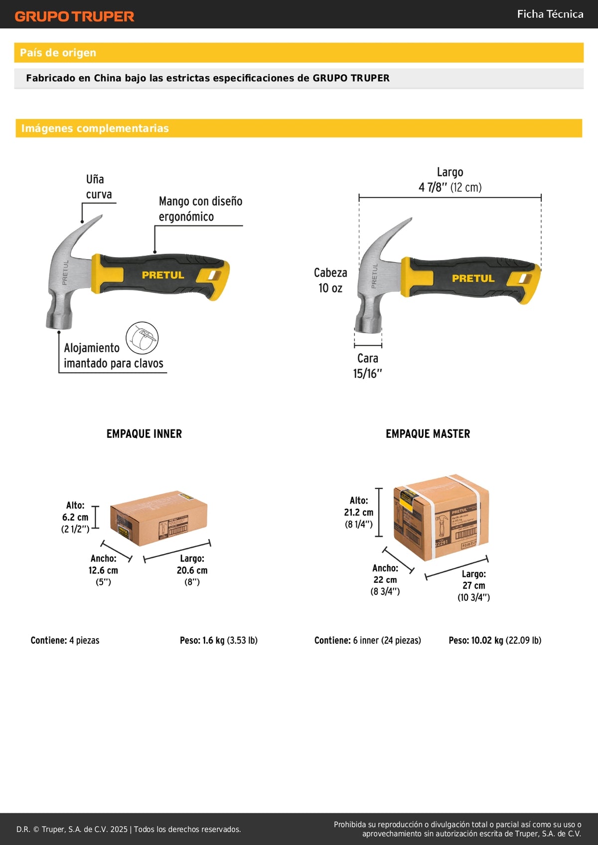 Martillo Pretul 10 oz Comfort Grip MO-10E - Cabeza Imantada Acero Pulido - Herramienta Profesional Carpintería