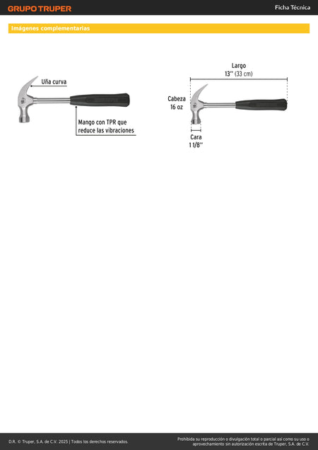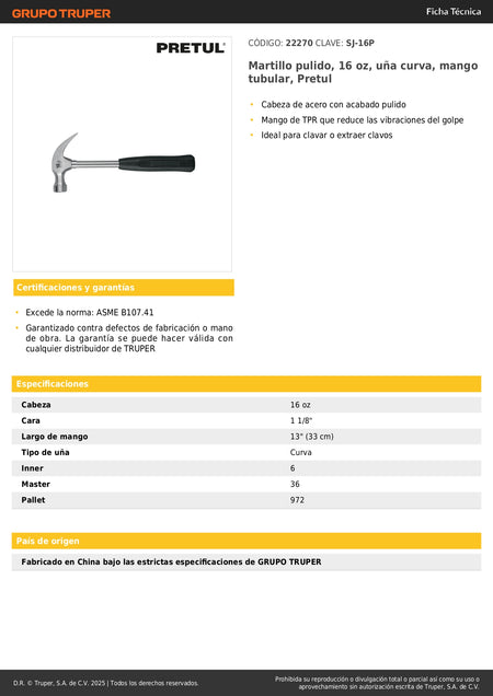 Martillo Pretul 16 oz Uña Curva SJ-16P - Mango Antivibración TPR para Clavar y Extraer Clavos