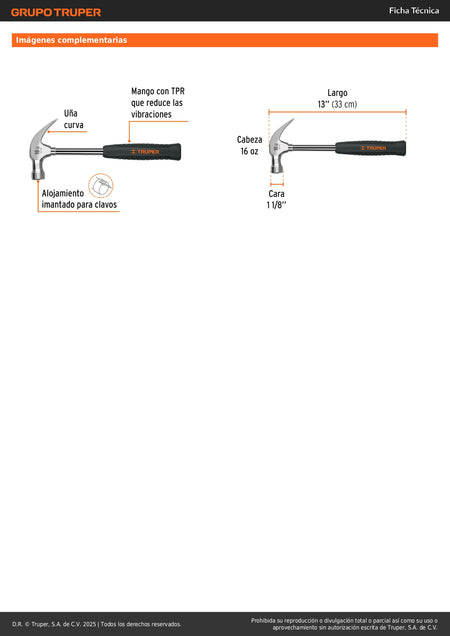 Martillo Profesional 16 oz SJ-16 Uña Curva Anti-Vibración - Ideal para Clavar y Extraer Clavos con Precisión