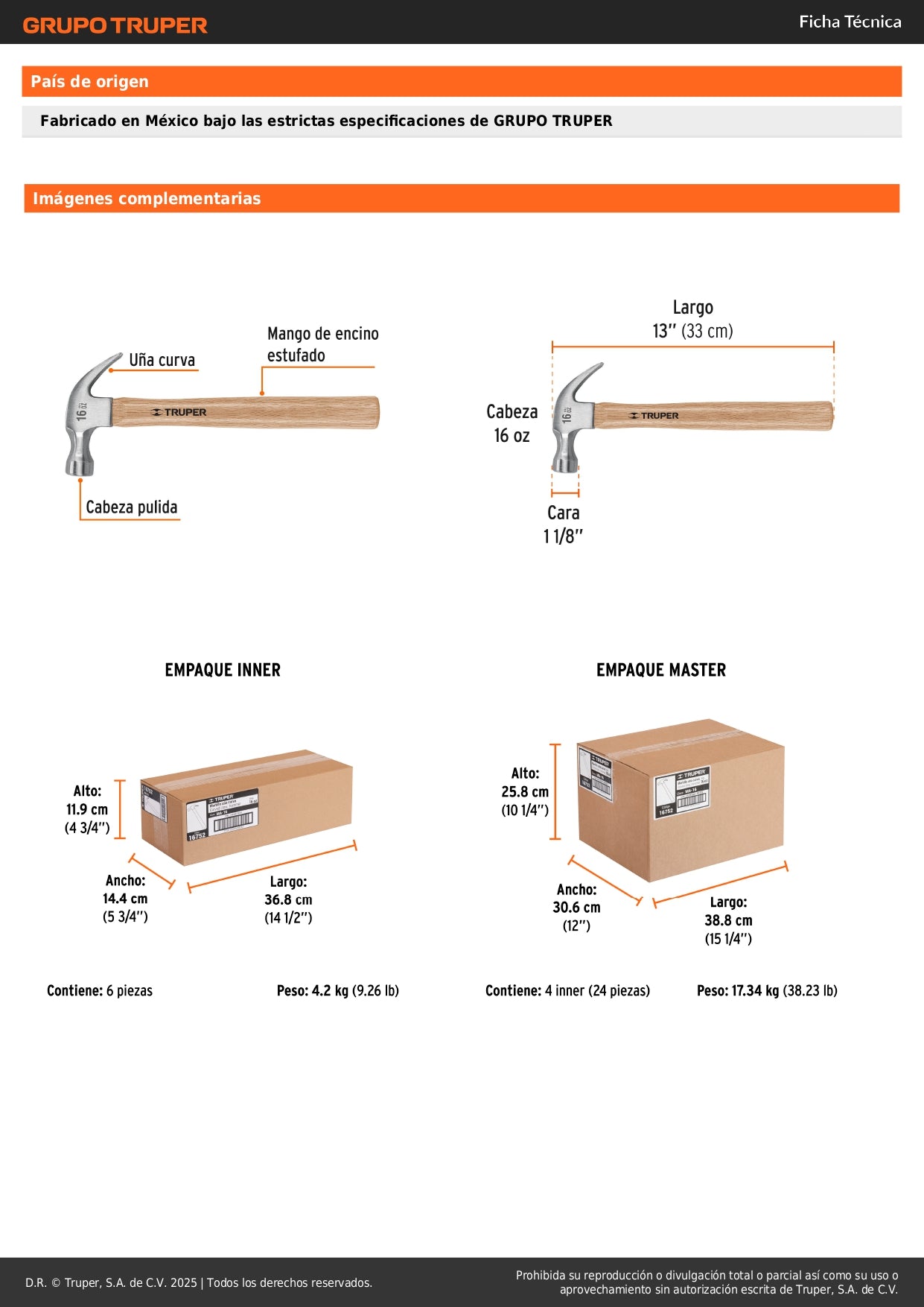 Con el martillo TRUPER MA-16, obtienes una herramienta confiable que combina diseño tradicional con calidad profesional. Su construcción robusta garantiza años de uso intensivo, mientras que su peso equilibrado reduce la fatiga durante jornadas largas de trabajo.