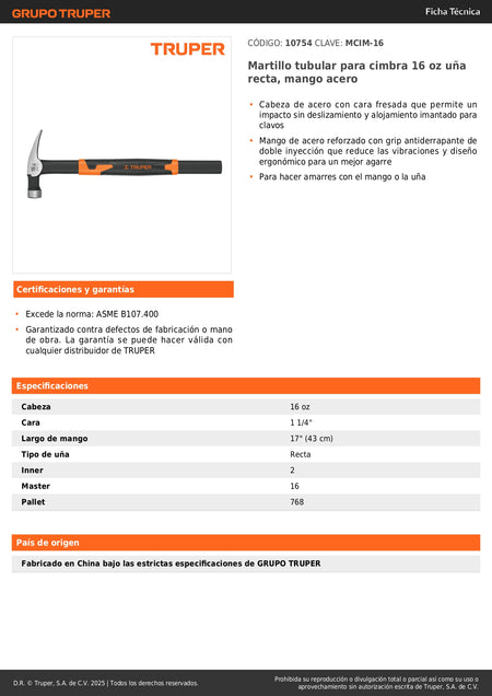 Martillo Tubular Cimbra 16 oz MCIM-16 - Mango Acero Antiderrapante, Cabeza Imantada, Uña Recta - Solución Profesional para Construcción y Carpintería