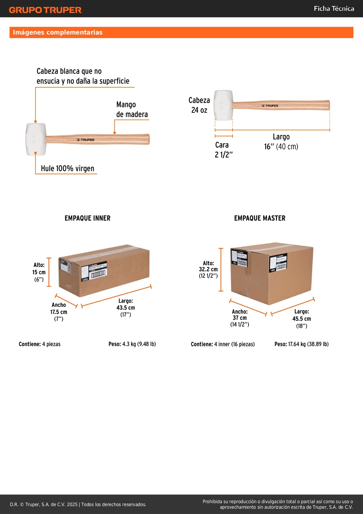 Este mazo de goma profesional combina la resistencia de las herramientas Truper con un diseño pensado para proteger tus materiales. Su cabeza de hule blanco no deja residuos ni marcas, mientras que su peso de 24 onzas proporciona el balance perfecto entre potencia y control.
