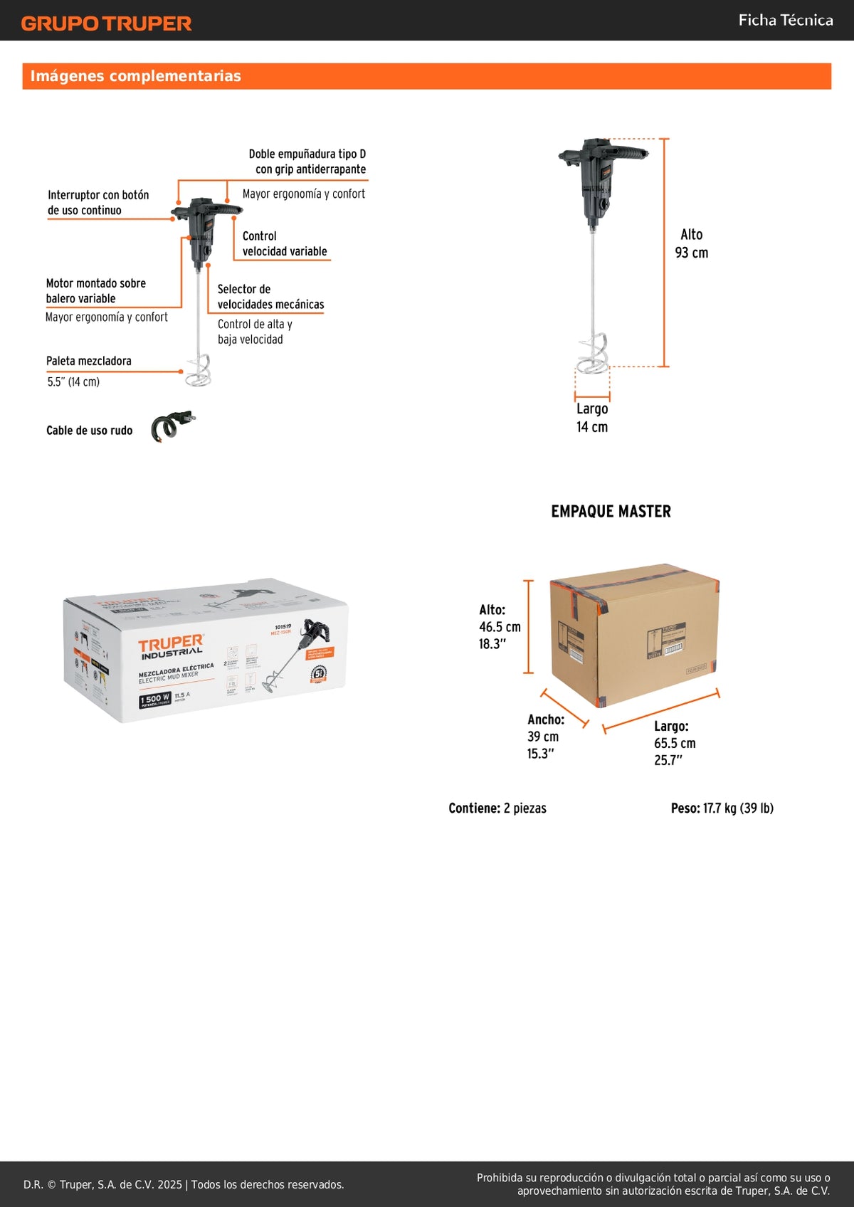 Mezcladora Eléctrica Industrial TRUPER 1500W MEZ-150N - Mezcla Mortero, Cemento y Pintura de Alta Viscosidad con 2 Velocidades